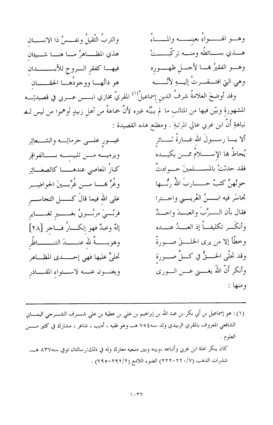 وقد أوضح العلامة شرف الدين إسماعيل (¬1) المقري مخازي ابن عربي في قصيدته المشهورة وبين فيها من المثالب ما لم يبمنه غيره لأن جماعة من أهل زبيد أوهموا من ليس له نباهة أن ابن عربي عالي المرتبة. ومطلع هذه القصيدة: