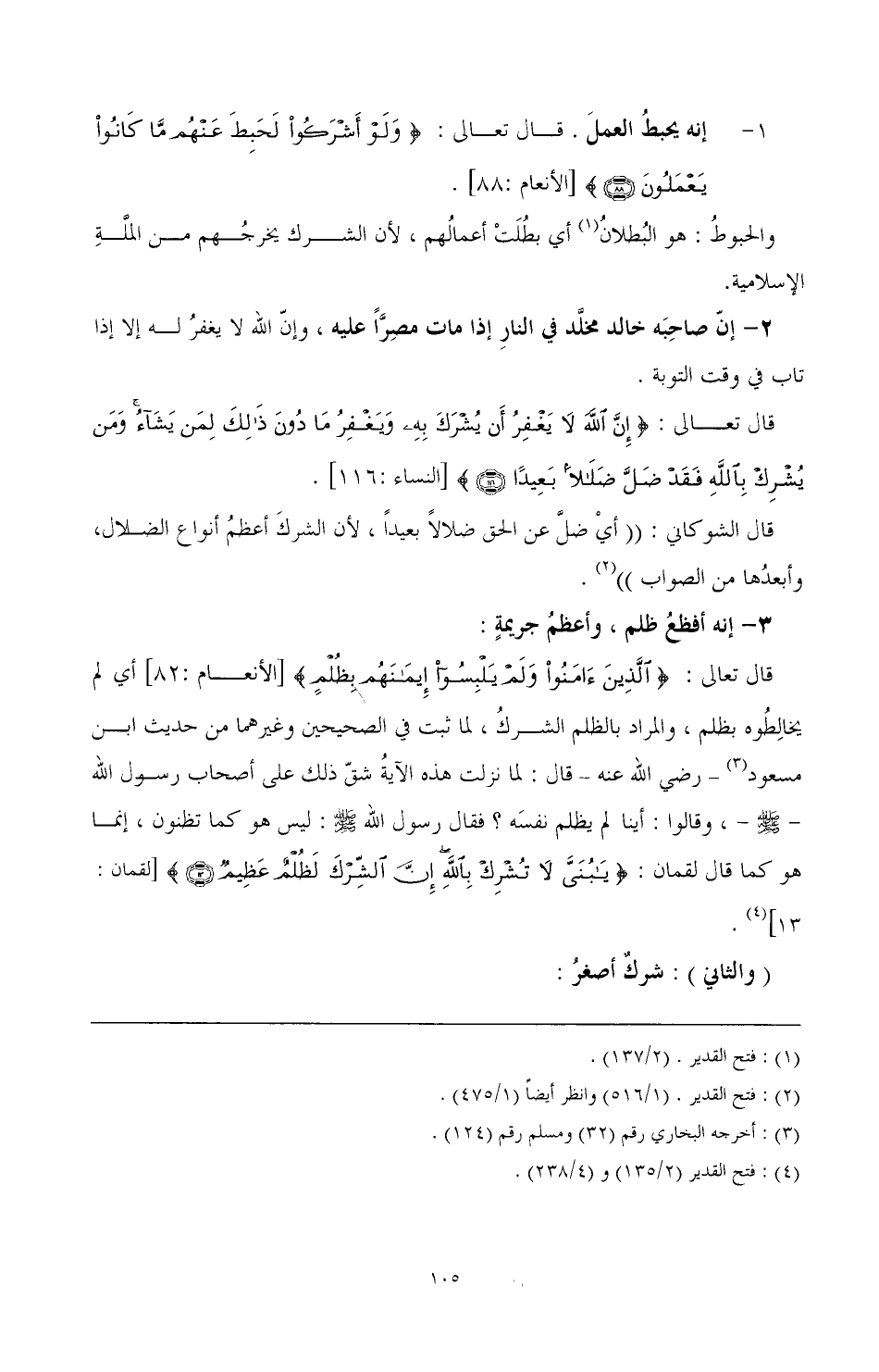 قال تعالى: {الذين آمنوا ولو يلبسوا إيمانهم بظلم} [الأنعام: 82] أي لم يخالطوه بظلم، والمراد بالظلم الشرك، لما ثبت في الصحيحين وغيرهما من حديث ابن مسعود (¬3) - رضي الله عنه- قال: لما نزلت هذه الآية شق ذلك على أصحاب رسول الله - صَلَّى اللهُ عَلَيْهِ وَسَلَّمَ- وقالوا: أينا لم يظلم نفسه؟ فقال رسول الله صَلَّى اللهُ عَلَيْهِ وَسَلَّمَ: ليس هو كما تظنون، إنما هو كما قال لقمان: {يا بني لا تشرك بالله إن الشرك لظلم عظيم} [لقمان: 13] (¬4).