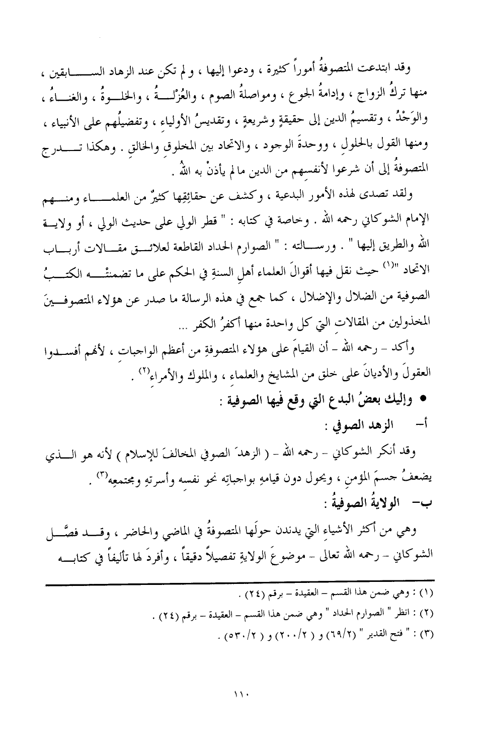 ولقد تصدى لهذه الأمور البدعية، وكشف عن حقائقها كثير من العلماء ومنهم الإمام الشوكاني رحمه الله. وخاصة في كتابه: " قطر الولي على حديث الولي، أو ولاية الله والطريق إليها ". ورسالته: " الصوارم الحداد القاطعة لعلائق مقالات أرباب الاتحاد" (¬1) حيث نقل فيها أقوال العلماء أهل السنة في الحكم على ما تضمنته الكتب الصوفية من الضلال والإضلال، كما جمع في هذه الرسالة ما صدر عن هؤلاء المتصوفين المخذولين من المقالات التي كل واحدة منها أكفر الكفر ...