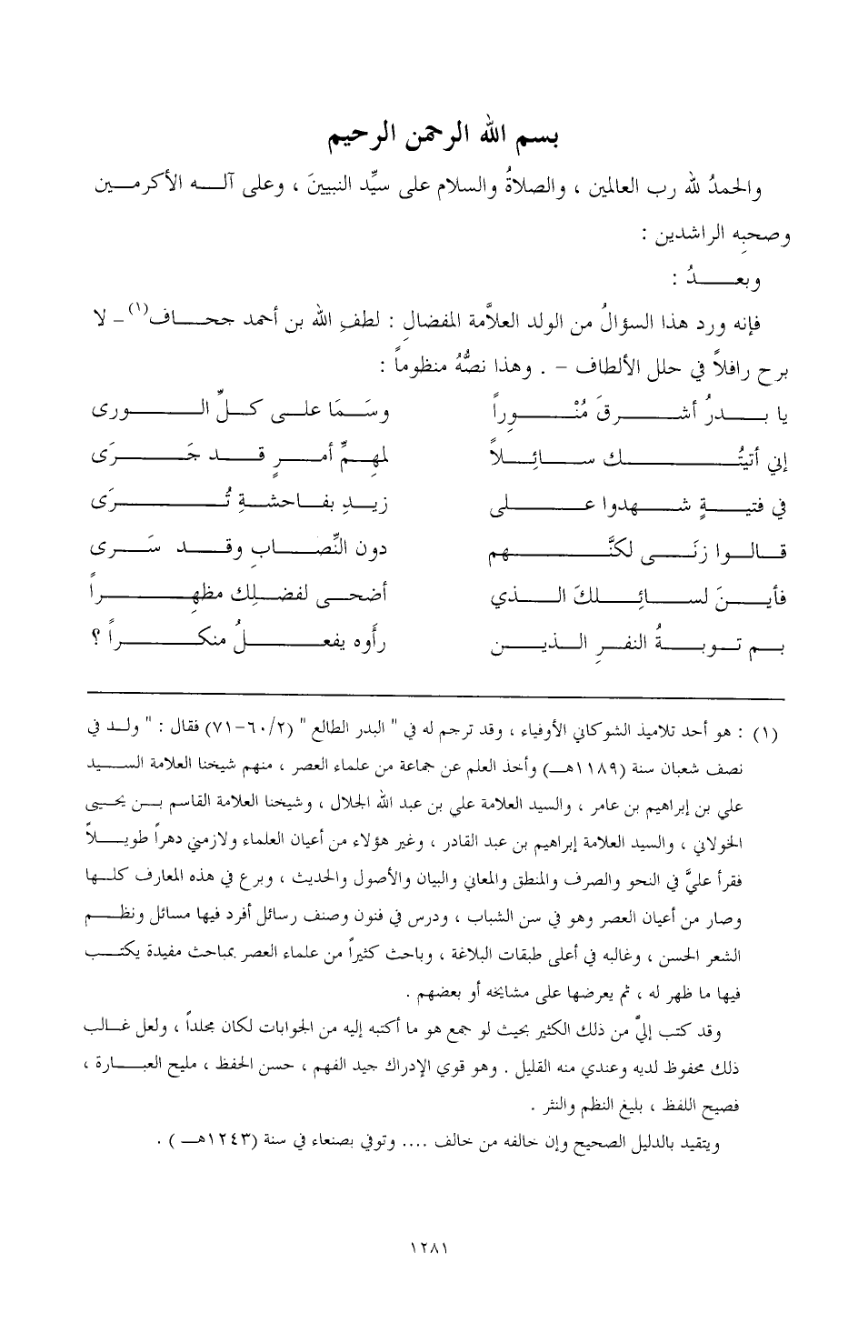 فإنه ورد هذا السؤال من الولد العلامة المفضال: لطف الله بن أحمد جحاف (1) - لا برح رافلا في حلل الألطاف-. وهذا نصه منظوما: