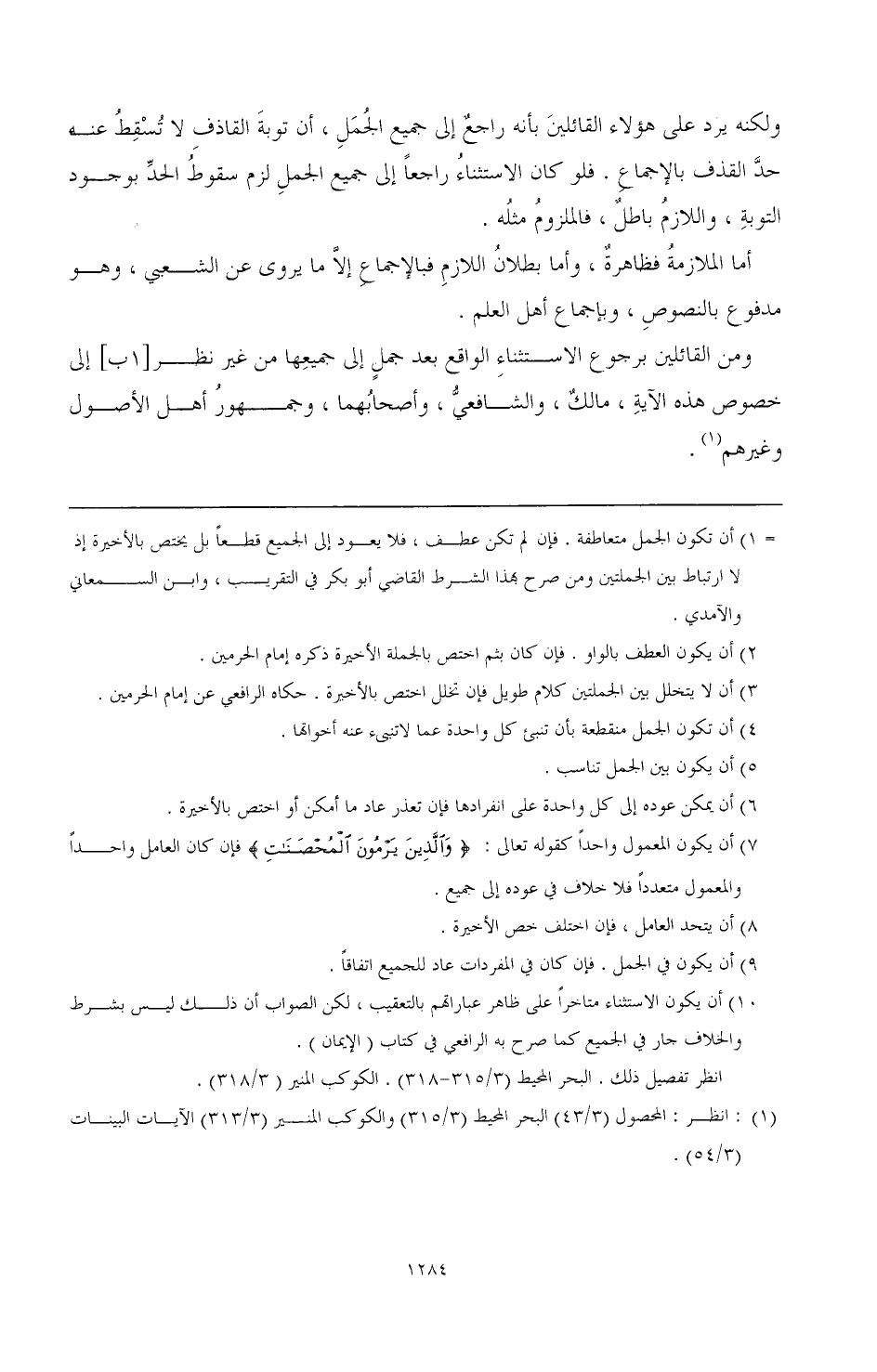 ولكنه يرد على هؤلاء القائلين بأنه راجع إلى جميع الجمل، أن توبة القاذف لا تسقط عنه حد القذف بالإجماع. فلو كان الاستثناء راجعا إلى جميع الجمل لزم سقوط الحد بوجود التوبة، واللازم باطل، فالملزوم مثله.