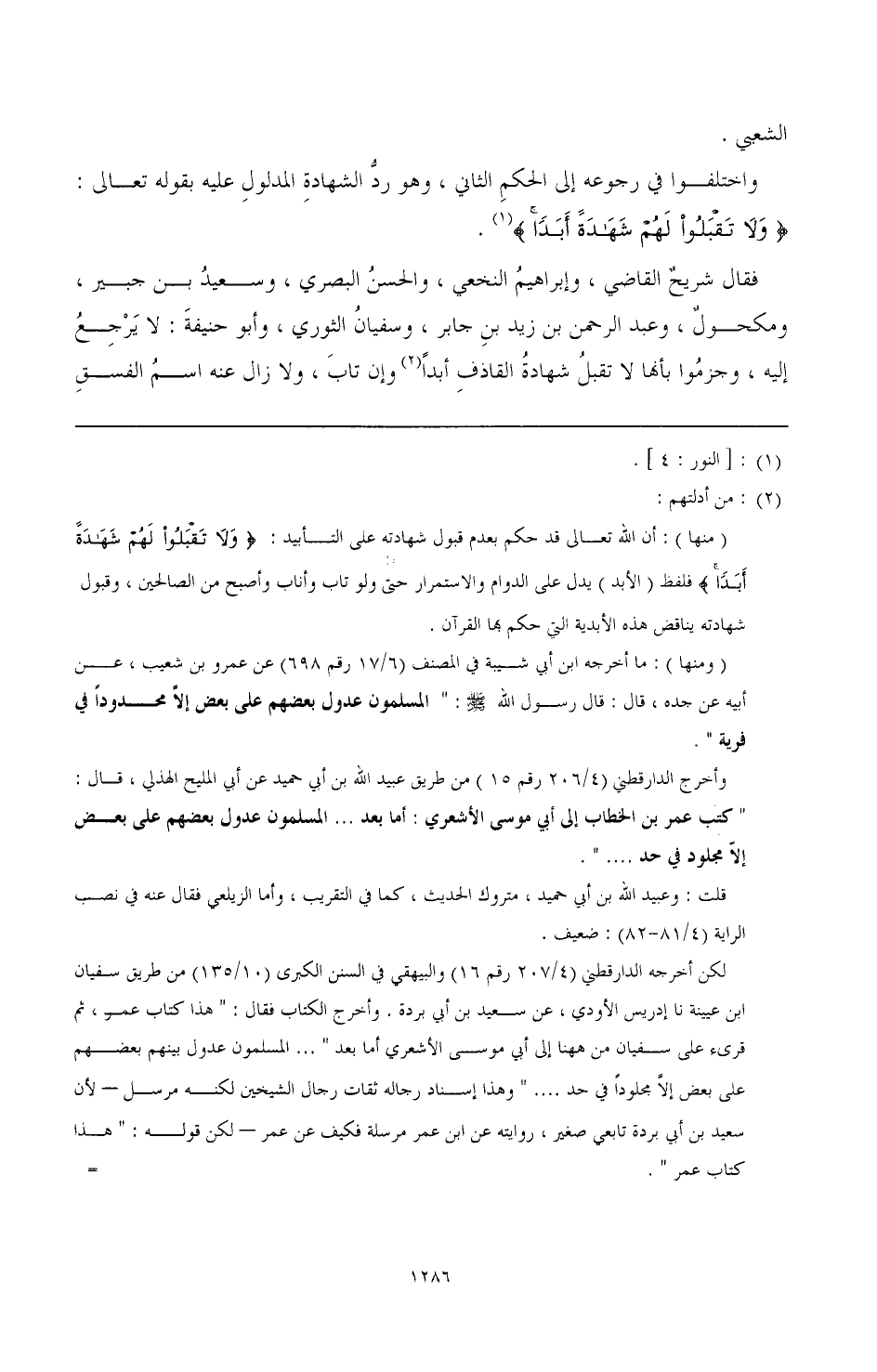 واختلفوا في رجوعه إلى الحكم الثاني، وهو رد الشهادة المدلول عليه بقوله تعالى: {وَلَا تَقْبَلُوا لَهُمْ شَهَادَةً أَبَدًا} (¬1).