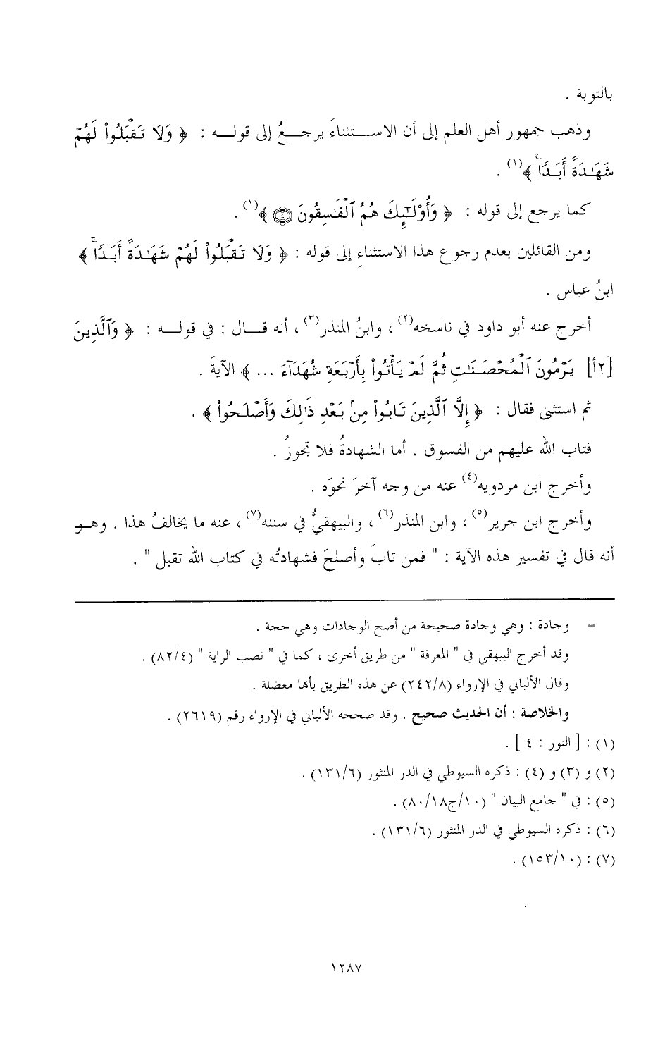أخرج عنه أبو داود في ناسخه (¬3)، وابن المنذر (¬4)، أنه قال: في قوله:} وَالَّذِينَ [2أ] يَرْمُونَ الْمُحْصَنَاتِ ثُمَّ لَمْ يَأْتُوا بِأَرْبَعَةِ شُهَدَاءَ {الآية. ثم استثنى فقال:} إِلَّا الَّذِينَ تَابُوا مِنْ بَعْدِ ذَلِكَ وَأَصْلَحُوا. فتاب الله عليهم من الفسوق. أما الشهادة فلا تجوز. وأخرج ابن مردويه (¬5) عنه من وجه أخر نحوه.