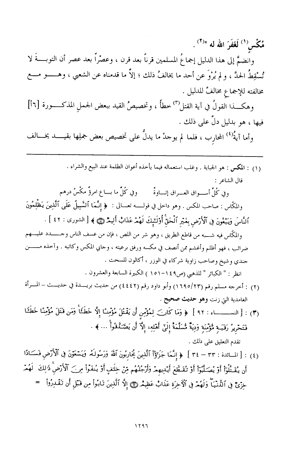 (¬4) [المائدة: 33 - 34] {إِنَّمَا جَزَاءُ الَّذِينَ يُحَارِبُونَ اللَّهَ وَرَسُولَهُ وَيَسْعَوْنَ فِي الْأَرْضِ فَسَادًا أَنْ يُقَتَّلُوا أَوْ يُصَلَّبُوا أَوْ تُقَطَّعَ أَيْدِيهِمْ وَأَرْجُلُهُمْ مِنْ خِلَافٍ أَوْ يُنْفَوْا مِنَ الْأَرْضِ ذَلِكَ لَهُمْ خِزْيٌ فِي الدُّنْيَا وَلَهُمْ فِي الْآخِرَةِ عَذَابٌ عَظِيمٌ إِلَّا الَّذِينَ تَابُوا مِنْ قَبْلِ أَنْ تَقْدِرُوا عَلَيْهِمْ فَاعْلَمُوا أَنَّ اللَّهَ غَفُورٌ رَحِيمٌ}
