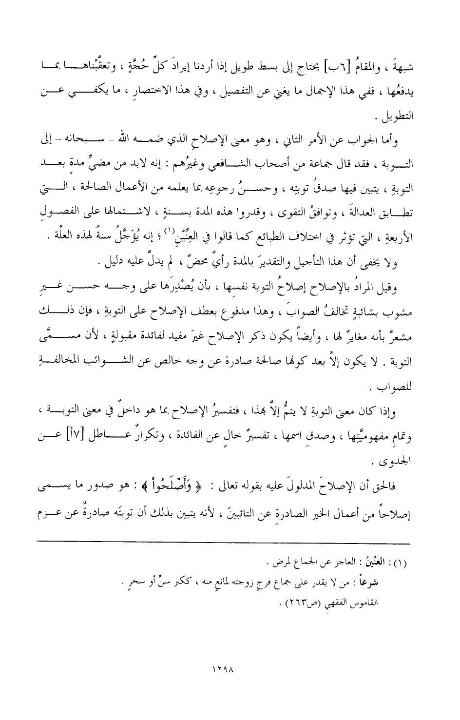 وإذا كان معنى التوبة لا يتم إلا إذا، فتفسير الإصلاح. مما هو داخل في معنى التوبة، وتمام مفهوميتها، وصدق اسمها، تفسير خال عن الفائدة، وتكرار عاطل [7أ] عن ا لجدوى.