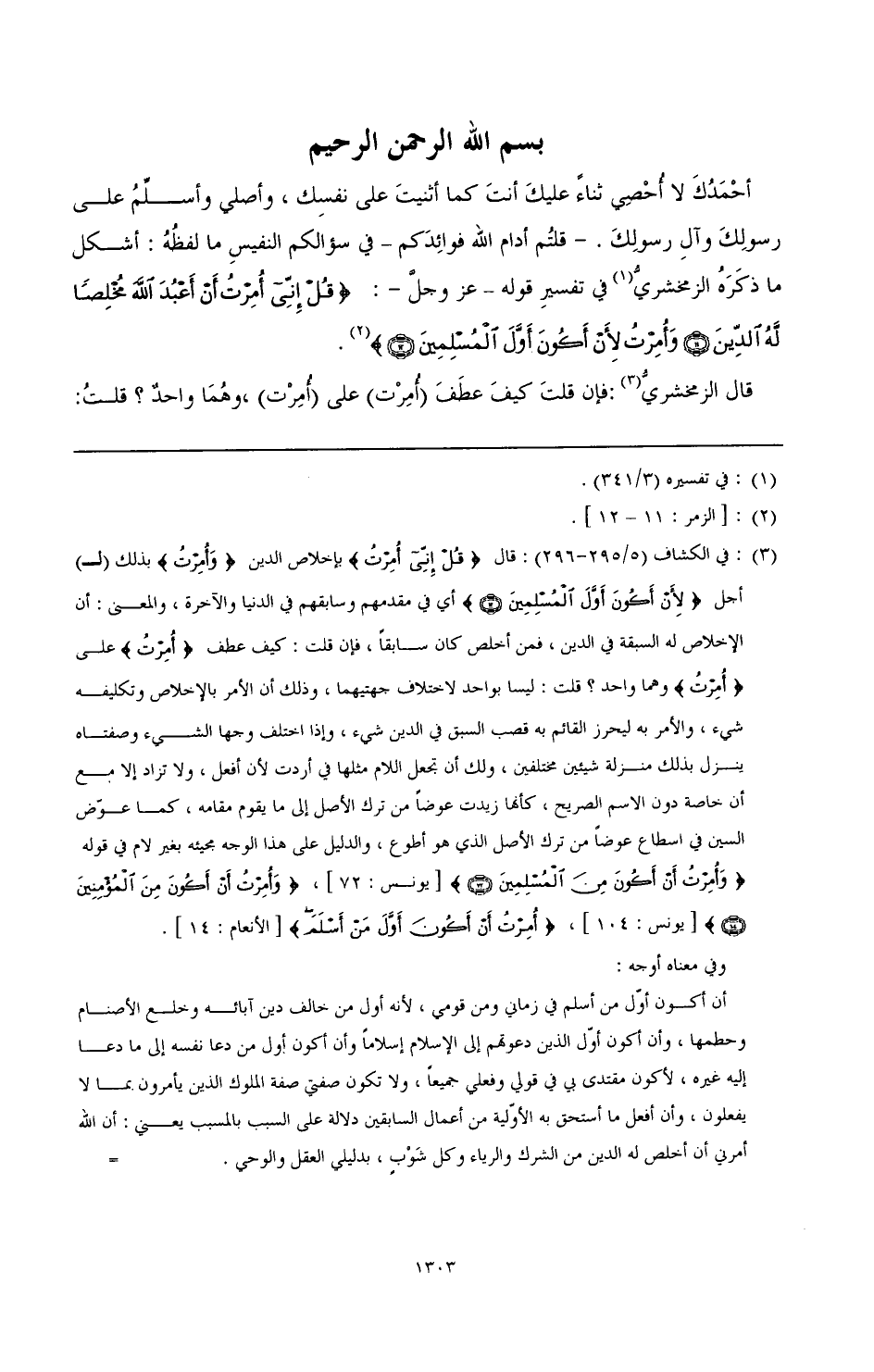 أحمدك لا أحصى ثناء عليك أنت كما أثنيت على نفسك، وأصلي وأسلم على رسولك وإلى رسولك.- قلتم أدام الله فوائدكم- في سؤالكم النفيس ما لفظه: أشكل ما ذكره الزمخشري (¬1) في تفسير قوله- عز وجل-: {قُلْ إِنِّي أُمِرْتُ أَنْ أَعْبُدَ اللَّهَ مُخْلِصًا لَهُ الدِّينَ وَأُمِرْتُ لِأَنْ أَكُونَ أَوَّلَ الْمُسْلِمِينَ} (¬2).