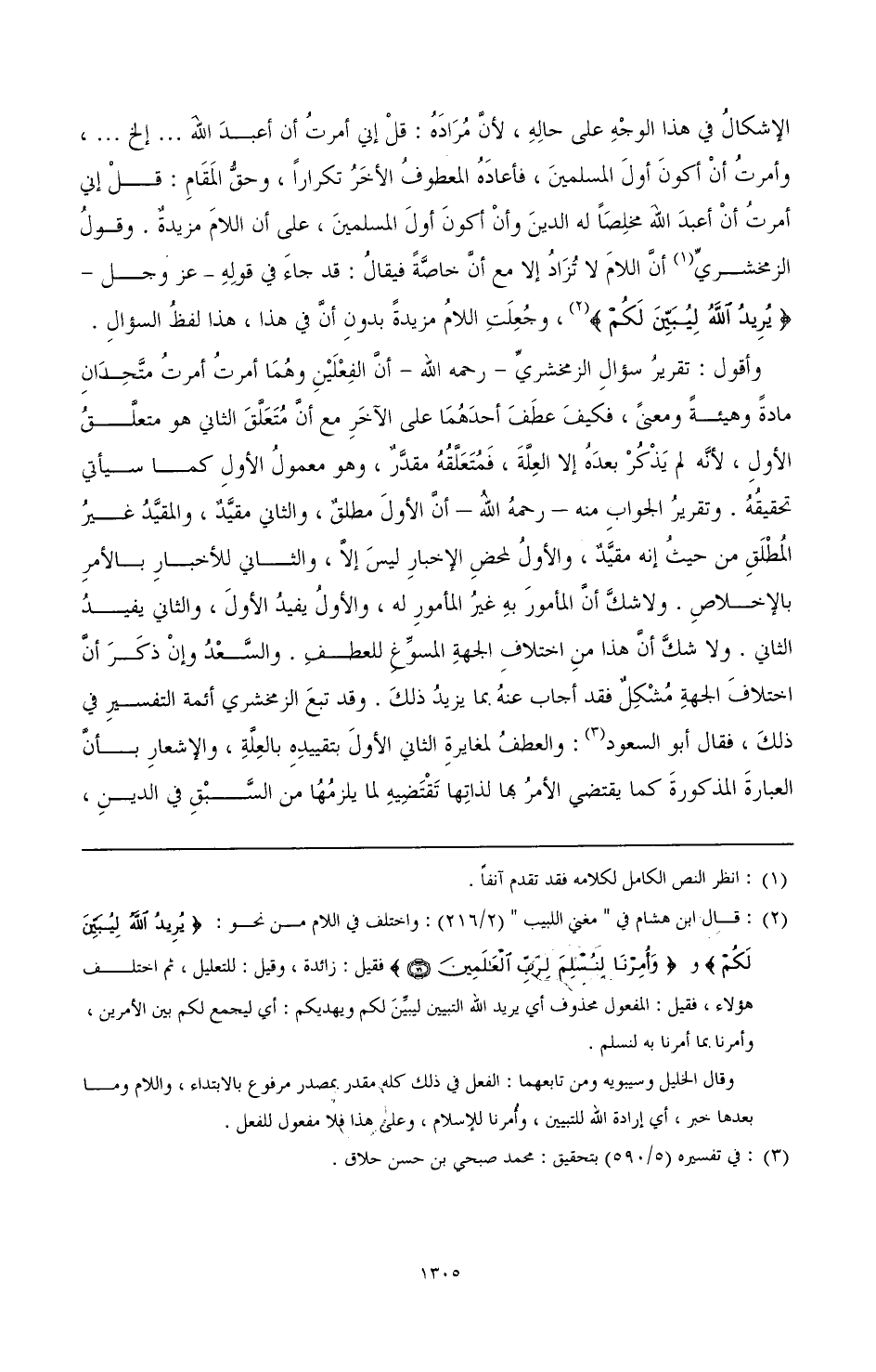 (¬2) قال ابن هشام قي "مغني اللبيب" (2/ 216): واختلف في اللام من نحو: {يُرِيدُ اللَّهُ لِيُبَيِّنَ لَكُمْ} و {وَأُمِرْنَا لِنُسْلِمَ لِرَبِّ الْعَالَمِينَ} فقيل: زائدة، وقيل: للتعليل، ثم اختلف هؤلاء، فقيل: المفعول محذوف أي يريد الله التبين ليبين لكم ويهديكم: أي ليجمع لكم بين الأمرين، وأمرنا. مما أمرنا له لنسلم.