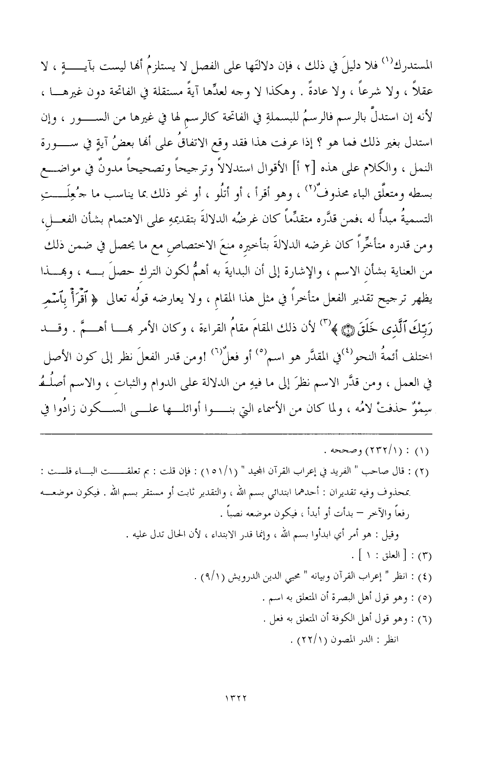 المستدرك (¬1) فلا دليل في ذلك، فإن دلالتها على الفصل لا يستلزم أنها ليست بآية، لا عقلا، ولا شرعا، ولا عادة. وهكذا لا وجه لعدها آية مستقلة في الفاتحة دون غيرها، لأنه إن استدل بالرسم فالرسم للبسملة في الفاتحة كالرسم لها في غيرها من السور، وإن استدل بغير ذلك فما هو؟ إذا عرفت هذا فقد وقع الاتفاق على أنها بعض آية في سورة النمل، والكلام على هذه [2أ] الأقوال استدلا وترجيحا وتصحيحا مدون في مواضع بسطه ومتعلق الباء محذوف (¬2)، وهو أقرأ، أو أتلو، أو نحو ذلك. مما يناسب ما جعلت التسمية مبدأ له، فمن قدره متقدما كان غرضه الدلالة بتقديمه على الاهتمام بشأن الفعل، ومن قدره متأخرا كان غرضه الدلالة بتأخيره منع الاختصاص مع ما يحصل في ضمن ذلك من العناية بشأن الاسم، والإشارة إلى أن البداية به أهم لكون الترك حصل به، وهذا يظهر ترجيح تقدير الفعل متأخرا في مثل هذا المقام، ولا يعارضه قوله تعالى {اقْرَأْ بِاسْمِ رَبِّكَ الَّذِي خَلَقَ} (¬3) لأن ذلك المقام مقام القراءة، وكان الأمر بها أهم. وقد اختلف أئمة النحو (¬4) في المقدر هو اسم (¬5) أو فعل (¬6)! ومن قدر الفعل نظر إلى كون الأصل في العمل، ومن قدر الاسم نظر إلى ما فيه من الدلالة على الدوام والثبات، والاسم أصله سمو حذفت لامه، ولما كان من الأسماء التي بنوا أوائلها على السكون زادوا في