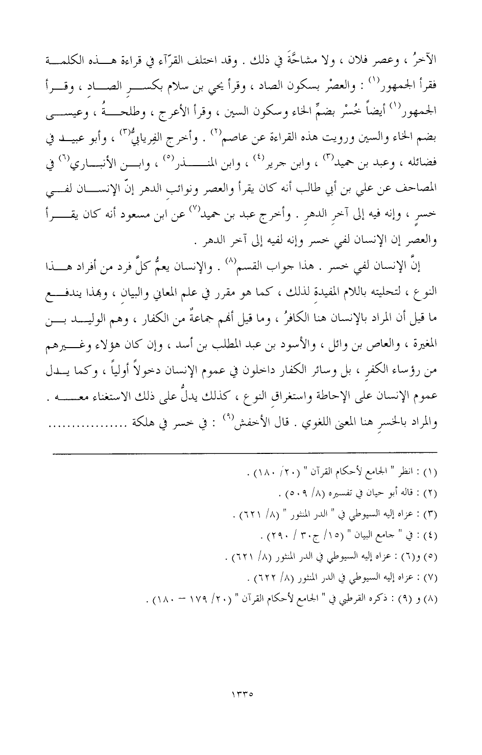 إن الإنسان لفي خسر. هذا جواب القسم (¬10). والإنسان يعم كل فرد من أفراد هذا النوع، لتحليته باللام المفيدة لذلك، كما هو مقرر في علم المعاني والبيان، وهذا يندفع ما قيل أن المراد بالإنسان هنا الكافر، وما قيل أفم جماعة من الكفار، وهم الوليد بن المغيرة، والعاص بن وائل، والأسود بن عبد المطلب بن أسد، وإن كان هؤلاء وغيرهم من رؤساء الكفر، بل وسائر الكفار داخلون في عموم الإنسان دخولا أوليا، وكما يدل عموم الإنسان على الإحاطة واستغراق النوع، كذلك يدلا على ذلك الاستغناء معه. والمراد بالخسر هنا المعنى اللغوي. قال الأخفش (¬11): في خسر في ملكة .... ....