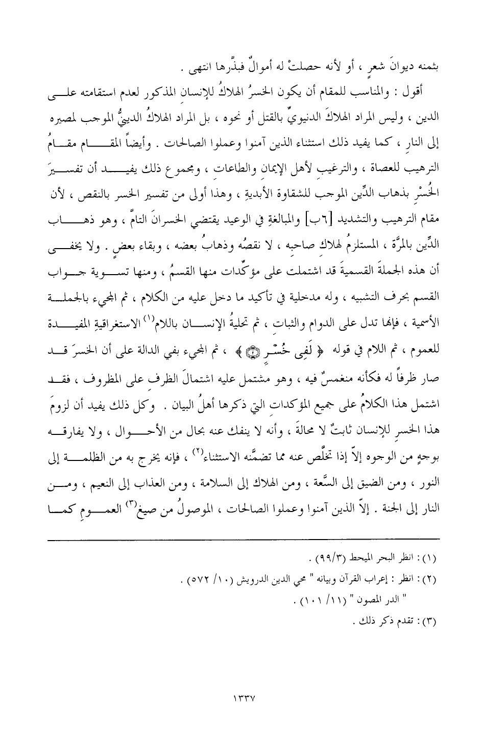 أقول: والمناسب للمقام أن يكون الخسر الهلاك للإنسان المذكور لعدم استقامته على الدين، وليس المراد الهلاك الدنيوي بالقتل أو نحوه، بل المراد الهلاك الديني الموجب لمصيره إلى النار، كما يفيد ذلك استثناء الذين آمنوا وعملوا الصالحات. وأيضا المقام مقام الترهيب للعصاة، والترغيب لأهل الإيمان والطاعات، ومجموع ذلك يفيد أن تفسير الخسر بذهاب الدين الموجب للشقاوة الأبدية، وهذا أولى من تفسير الخسر بالنقص، لأن مقام الترهيب والتشديد [6ب] والمبالغة في الوعيد يقتضي الخسران التام، وهو ذهاب الدين بالمرة، المستلزم لهلاك صاحبه، لا نقصه وذهاب بعضه، وبقاء بعض. ولا يخفى أن هذه الجملة القسمية قد اشتملت على مؤكدات منها القسم، ومنها تصوية جواب القسم بحرف التشبيه، وله مدخلية في تأكيد ما دخل عليه من الكلام، ثم المجيء بالجملة الأسمية، فإنها تدل على الدوام والثبات، ثم تحلية الإنسان باللام (¬1) الإستغراقية المفيدة للعموم، ثم اللام في قوله {لفي خسر}، ثم أبرء في الدالة على أن الخسر قد صار ظرفا له فكأنه منغمس فيه، وهو مشتمل عليه اشتمال الظرف على المظروف، فقد اشتمل هذا الكلام على جميع المؤكدات التي ذكرها أهل البيان. وكل ذلك يفيد أن لزوم هذا الخسر للإنسان ثابت لا محالة، وأنه لا ينفك عنه بحال من الأحوال، ولا يفارقه بوجه من الوجوه إلا إذا تخلص عنه مما تضمنه الاستثناء (¬2)، فإنه يخرج به من الظلمة إلى النور، ومن الضيق إلى السعة، ومن الهلاك إلى السلامة، ومن العذاب إلى النعيم، ومن أفار إلى الجشة. إلا الذين آمنوا وعملوا الصالحات، الموصول من صيغ (¬3) العموم كما