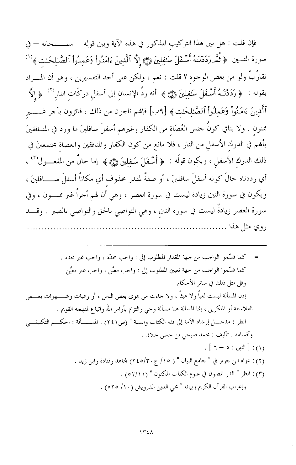 فإن قلت: هل بين هذا التركيب المذكور في هذه الآية وبن قوله- سبحانه- في سورة التين {ثُمَّ رَدَدْنَاهُ أَسْفَلَ سَافِلِينَ إِلَّا الَّذِينَ آمَنُوا وَعَمِلُوا الصَّالِحَاتِ} (¬1) تقارب ولو من بعض الوجوه؟ قلت: نعم، ولكن على أحد التفسيرين، وهو أن المراد بقوله: {رددناه أسفل سافلين} أنه رد الإنسان إلى أسفل دركات النار (¬2) {إِلَّا الَّذِينَ آمَنُوا وَعَمِلُوا الصَّالِحَاتِ} [9ب] ناجون من ذلك، فائزون بأجر غير ممنون. ولا ينافي كون جنس العصاة من الكفار وغيرهم أسفل سافلين ما ورد في المنافقين بأنهم في الدرك الأسفل من النار، فلا مانع من كون الكفار والمنافقين والعصاة مجتمعين في ذلك الدرك الأسفل، ويكون قوله: {أسفل سافلين} إما حال المفعول (¬3) أي رددناه حال كونه أسفل سافلين، أو صفة لمقدر محذوف أي مكانا أسفل سافلين، ويكون في سورة التين زيادة ليست في سورة العصر، وهي أن لهم أجرا غير ممضون، وفي سورة العصر زيادة ليست في سورة التين، وهى التواصي بالحق والتواصي بالصبر. وقد روي مثل هذا. . . . . .