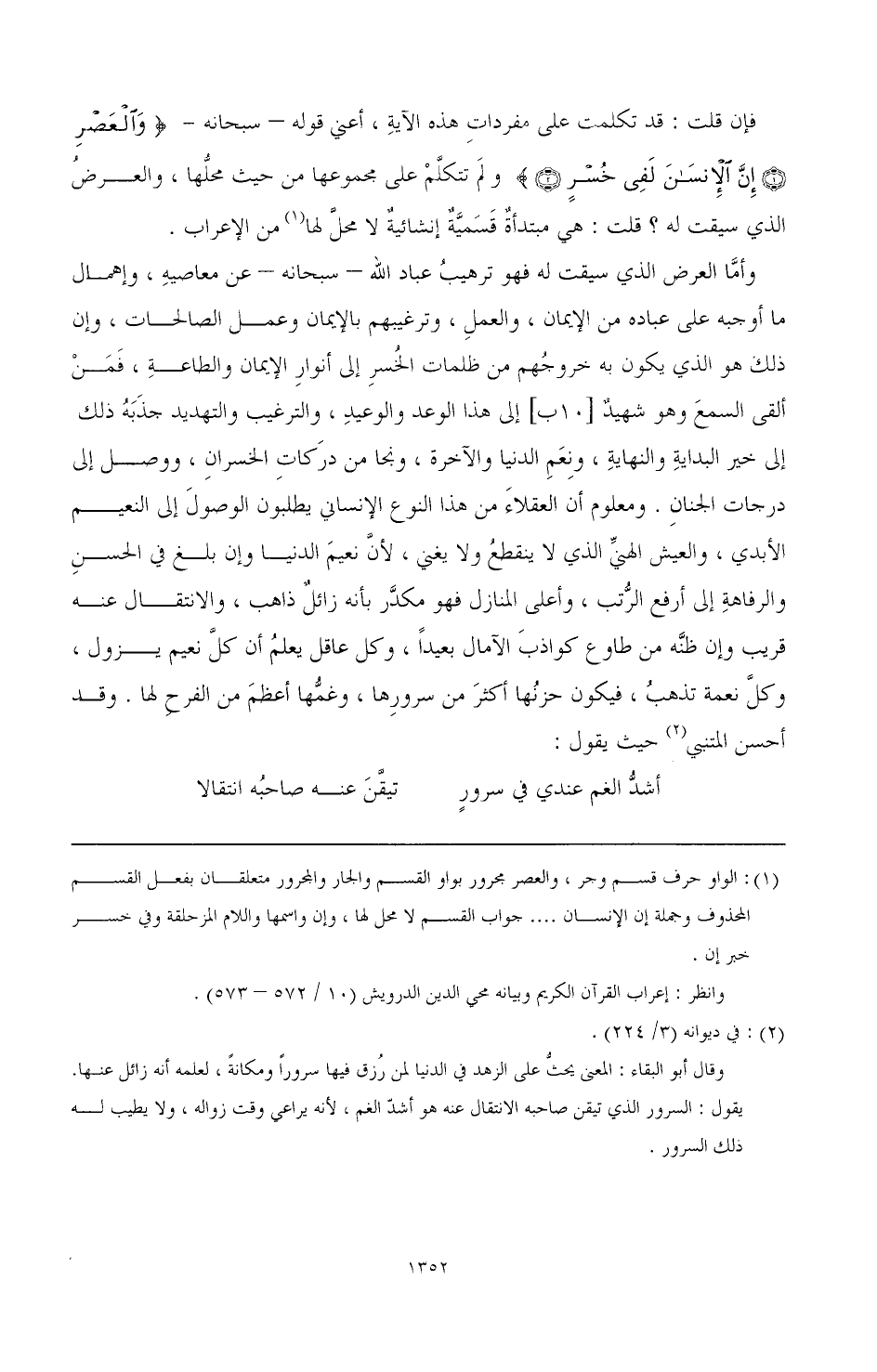 وأما العرض الذي سيقت له فهو ترهيب عباد الله- سبحانه- عن معاصيه، وإهمال م! ا أوجبه على عباده من الإيمان، والعمل، وترغيبهم بالإيمان وعمل الصالحات، وإن ذلك هو الذي يكون به خروجهم من ظلمات الخسر إلى أنوار الإيمان والطاعة، فمن ألقى السمع وهو شهيد [10ب] إلى هذا الوعد والوعيد، والترغيب والتهديد جذبه ذلك إلى خير البداية والنهاية، ونعم الدنيا والآخرة، ونجا من دركات الخسران، ووصل إلى درجات الجنان. ومعلوم أن العقلاء من هذا النوع الإنساني يطلبون الوصول إلى النعيم الأبدي، والعيش الذي لا ينقطع ولا يغني، لأن نعيم الدنيا وإن بلغ في الحسن والرفاهة إلى أرفع الرتب، وأعلى المنازل فهو مكدر بأنه زائل ذاهب، والانتقال عنه قريب وإن ظنه من طاوع كواذب الآمال بعيدا، وكل عاقل يعلم أن كل نعيم يزول، وكل نعمة تذهب، فيكون حزنها أكثر من سرورها، وغمها أعظم من الفرح لها. وقد أحسن المتنبي (¬2) حيث يقول: