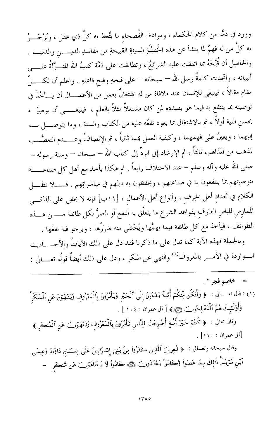 (¬1) قال تعالى: {وَلْتَكُنْ مِنْكُمْ أُمَّةٌ يَدْعُونَ إِلَى الْخَيْرِ وَيَأْمُرُونَ ِالْمَعْرُوفِ وَيَنْهَوْنَ عَنِ الْمُنْكَرِ وَأُولَئِكَ هُمُ الْمُفْلِحُونَ} آل عمران:104