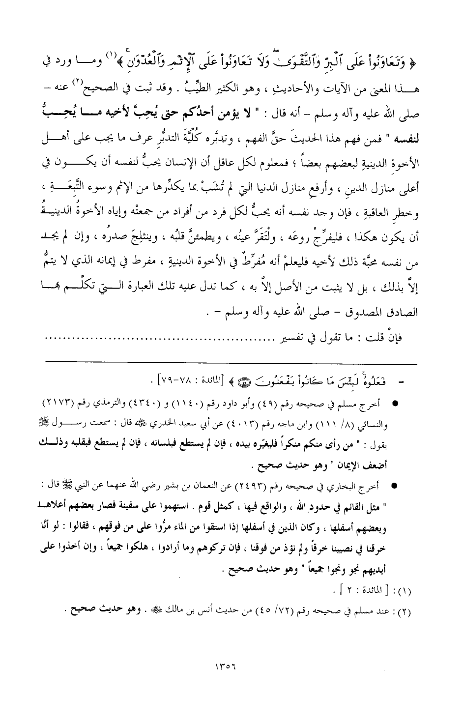 {وَتَعَاوَنُوا عَلَى الْبِرِّ وَالتَّقْوَى وَلَا تَعَاوَنُوا عَلَى الْإِثْمِ وَالْعُدْوَانِ} (¬1) وما ورد في هذا المعنى من الآيات والأحاديث، وهو الكثير الطيب. وقد ثبت في الصحيح (¬2) عنه- صدى الله عديه وآله وسلم- أنه قال: " لا يؤمن أحدكم حتى يدبره لأخيه ما يحب لنفسه " فمن فهم هذا الحديث حق الفهم، وتدبره كلية التدبر عرف ما يجب على أهل الأخوة الدينية لبعضهم بعضا، فمعلوم لكل عاقل أن الإنسان يحب لنفسه أن يكون في أعلى منازل الدين، وأرفع منازل الدنيا التي لم تشب. مما يكدرها من الإثم وسوء التبعة، وخطر العاقبة، فإن وجد نفسه أنه يحب لكل فرد من أفراد من جمعته وإياه الأخوة الدينية أن يكون هكذا، فليفرج روعه، ولتقر عينه، ويطمئن قلبه، وينثلج صدره، وإن لم يجد من نفسه محبة ذلك لأخيه فليعلم أنه مفرط في الأخوة الدينية، مفرط في إيمانه الذي لا يتم إلا بذلك، بل لا يثبت من الأصل إلا به، كما تدل عليه تلك العبارة التي تكلم ها الصادق المصدوق- صَلَّى اللهُ عَلَيْهِ وَآلِهِ وَسَلَّمَ-.