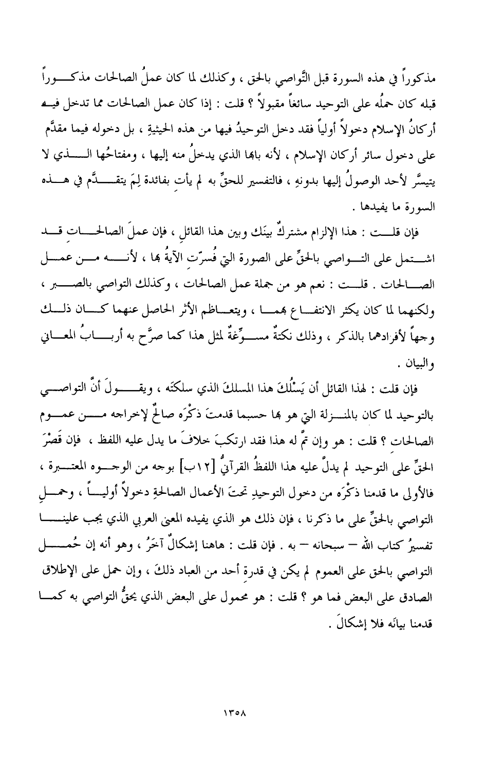 فإن قلت: لهذا القائل أن يسلك هذا المسلك الذي سلكته، ويقول أن التواصي بالتوحيد لما كان بالمنزلة التي هو ها حسبما قدمت ذكره صالح لإخراجه من عموم الصالحات؟ قلت: هو وإن تم له هذا فقد ارتكب خلاف ما يدل عليه اللفظ، فإن قصر الحق على التوحيد لم يدل عليه هذا اللفظ القرآني بوجه من الوجوه المعتبرة، فالأولى ما قدمنا ذكره من دخول التوحيد تحت الأعمال الصالحة دخولا أوليا، وحمل التواصي بالحق على ما ذكرنا، فإن ذلك هو الذي يفيده المعنى الذي يجب علينا تفسير كتاب الله- سبحانه- به. فإن قلت: هاهنا إشكال آخر، وهو أنه إن حمل التواصي بالحق على العموم لم يكن في قدرة أحد من العباد ذلك، وإن حمل على الإطلاق الصادق على البعض فما هو؟ قلت: هو محمول على البعض الذي يحق التواصي به كما قدمنا بيانه فلا إشكال.