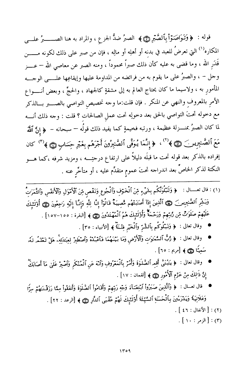 155 - 157 (¬2) التي تعرض للعبد في بدنه أو أهله أو ماله، فإن من صبر على ذلك لكونه من قدر الله، وما قضى به عليه كأن ذلك صبرا محمودا، ومنه الصبر عن معاصي الله- عز وجل-، والصبر على ما يقوم به من فرائضه من المداومة عليها وإيقاعها على الوجه المأمور به، ولاسيما ما كان يحتاج العالم به إلى مشقة كالجهاد، والحج، وبعض أنواع الأمر بالمعروف والنهى عن المنكر. فإن قلت: ما وجه تخصيص التواصي بالصبر بالذكر مع دخوله تحت التواصي بالحق بعد دخوله تحت عمل الصالحات؟ قلت: وجه ذلك أنه لما كان الصبر. منزلة عظيمة، ورتبه فخيمة كما يفيد ذلك قوله- سبحانه- {إن الله مع الصابرين} (¬3)، {إنما يوفى الصابرون أجرهم بغير حساب} (¬4) كان إفراده بالذكر بعد قوله تحت ما قبله دليلا على ارتفاع درجته، ومزيد شرفه، كما هو النكتة لذكر الخاص بعد اندراجه تحص عموم متقدم عليه، أو متأخر عنه.