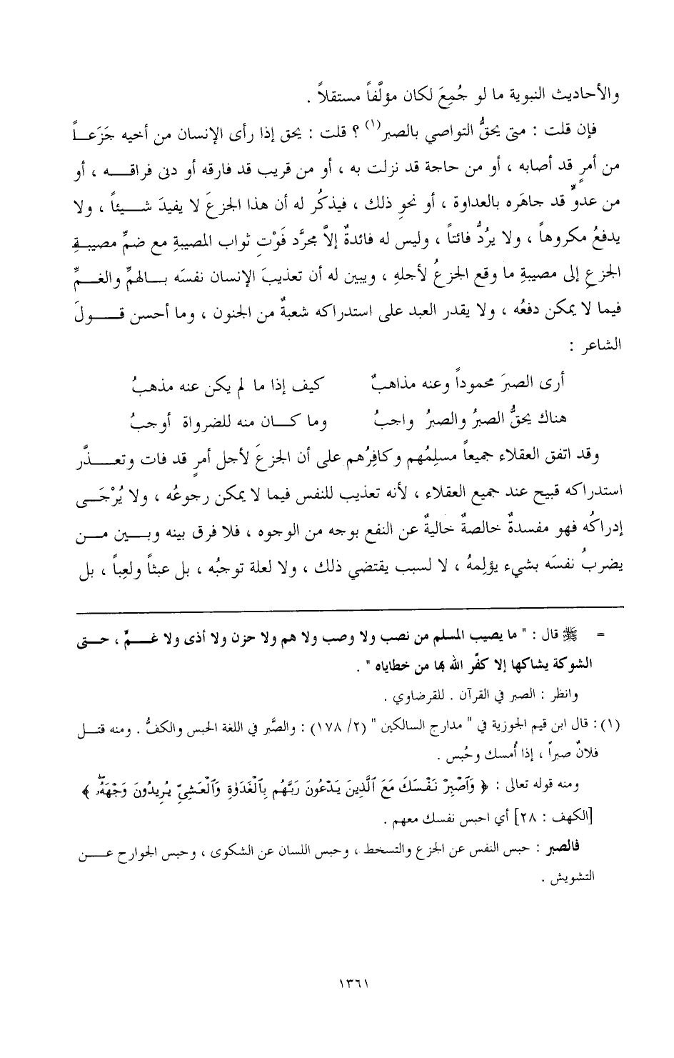 (¬1) قال ابن قيم الجوزية في " مدارج السالكين " (2/ 178): والصبر في اللغة الحبس والكف. ومنه قتل فلان صبرا، إذا امسك وحبس.