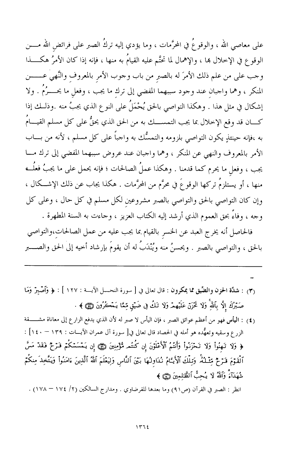على معاصي الله، والوقوع في المحرمات، وما يؤدي إليه ترك الصبر على فرائض الله من الوقوع في الإخلال ها، والإهمال لما تحتم عليه القيام به منها، فإنه إذا كان الأمر هكذا وجب على من علم ذلك الأمر له بالصبر من باب وجوب الأمر بالمعروف والنهى عن المنكر، وهما واجبان عند وجود سببهما المفضي إلى ترك ما يجب، وفعل ما يحرم. ولا إشكال في مثل هذا. وهكذا التواصي بالحق يحمل على النوع الذي يجب منه. وذلك إذا كان قد وقع الإخلال. مما يجب التمسك به من الحق الذي يحق على كل مسلم القيام به، فإنه حينئذ يكون التواصي بلزومه والتمسك به واجبا على كل مسلم، لأنه من باب الأمر بالمعروف والنهي عن المنكر، وهما واجبان عند عروض سببهما المفضي إلى ترك ما يجب، وفعل ما يحرم كما قدمنا. وهكذا عمل الصالحات، فإنه يحمل على ما يجب فعله منها، أو يستلزم تركها الوقوع في محرم من المحرمات. هكذا يجاب عن ذلك الإشكال، وإن كان التواصي بالحق والتواصي بالصبر مشروعين لكل مسلم في كل حال، وعلى كل وجه، وفاء بحق العموم الذي أرشد إليه الكتاب العزيز، وجاءت به السنة المطهرة. فالحاصل أنه يخرج العبد عن الخسر بالقيام. مما يجب عليه من عمل الصالحات، والتواصي بالحق، والتواصي بالصبر. ويحسن منه ويندب له أن يقوم بإرشاد أخيه إلى الحق والصبر