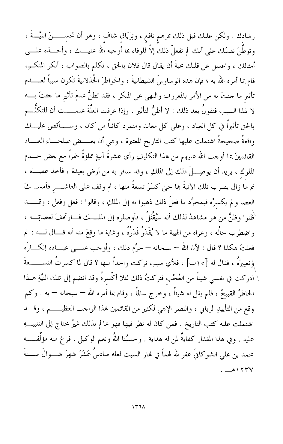 رشادك. ولكن عليك قبل ذلك. ممرهم نافع، وترياق شاف، وهو أن تحسن النية، وتوطن نفسك على أنك لم تفعل ذلك إلا للوفاء. مما أوجبه الله عليك، وأخذه على أمثالك، واغسل عن قلبك محبة أن يقال قال فلان بالحق، تكلم بالصواب، أنكر المنكر قام. مما أمره الله به، فإن هذه الوساوس الشيطانية، والخواطر الخذلانية تكون سببا لعدم تأثير ما جئت به من الأمر بالمعروف والنهي عن المنكر، فقد تظن عدم تأثير ما جئت به لا لهذا السبب فتقول بعد ذلك: لا أظن التأثير. وإذا عرفت العلة علمت أن للتكلم بالحق تأثيرا في كل العباد، وعلى كل معاند ومتمرد كائنا من كان، وسأقص عليك واقعة صحيحة اشتملت عليها كتب التاريخ المعتبرة، وهى أن بعض صلحاء العباد القائمين. مما أوجب الله عليهم من هذا التكليف رأى عشرة آنية مملوءة خمرا مع بعض خدم الملوك، يريد أن يوصل ذلك إلى الملك، وعد سافر به من أرض بعيدة، فأخذ عصاه، ثم ما زال يضرب تلك النية ها حتى كسر تسعة منها، ثم وقف على العاشر فأمسك العصا ولم يكسره فبمجرد ما فعل ذلك ذهبوا به إلى الملك، وقالوا: فعل وفعل، وقد ظنوا وظن من هو مشاهد لذلك أنه سيقتل، فأوصلوه إلى الملك فارتجف لعصاته، واضطرب حاله، وعراه من الهيبة ما لا يقدر قدره، وغاية ما وقع منه أنه قال له: فعلت هكذا؟ قال: لأن الله- سبحانه- حرم ذلك، وأوجب على عباده إنكاره وتغييره، فقال له، فلأي سبب تركت واحدا منها؟ قال لما كسرت اقصر. في نفسي شيئا من المجاب فتركت ذلك لئلا أكسره وقد انضم إلى تلك النية هذا الخاطر القبيح، فلم يقل له شيئا، وخرج سالما، وقام. مما أمره الله- سبحانه- به. وكم وقع من التأييد الرباني، والنصر الإلهي لكثير من القائمين هذا الواجب العظيم، وقد اشتملت عليه كتب التاريخ. فمن كان له نظر فيها فهو بذلك غير محتاج إلى التنبيه عليه. وفي هذا المقدار كفاية لمن له هداية. وحسبنا الله ونعم الوكيل.