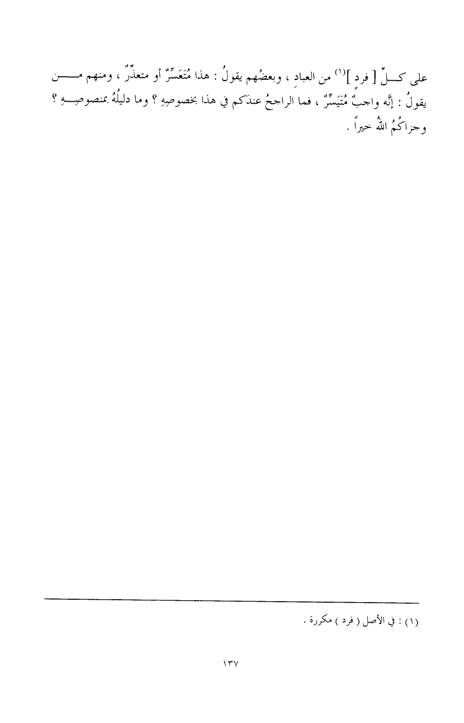 عن كل [فرد] (¬1) من العباد، وبعضهم يقول: هذا متعسر أو متعذر، ومنهم من يقول: إنه واجب متيسر، فما الراجح عندكم في هذا بخصوصه؟ وما دليله بمنصوصه؟ وجزاكم الله خيرا.