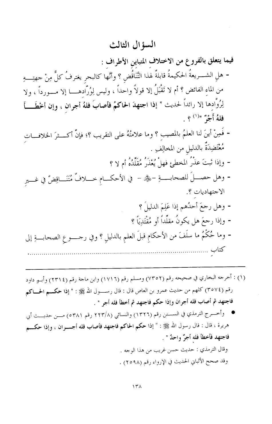 (¬1) أخرجه البخاري في صحيحه رقم (7352) ومسلم رقم (1716) وابن ماجه رقم (2314) وأبو داود رقم (3574) كلهم من حديث عمرو بن العاص قال: قال رسول الله صَلَّى اللهُ عَلَيْهِ وَسَلَّمَ: " إذا حكم الحاكم فاجتهد ثم أصاب فله أجران وإذا حكم فاجتهد ثم أخطأ فله أجر ".