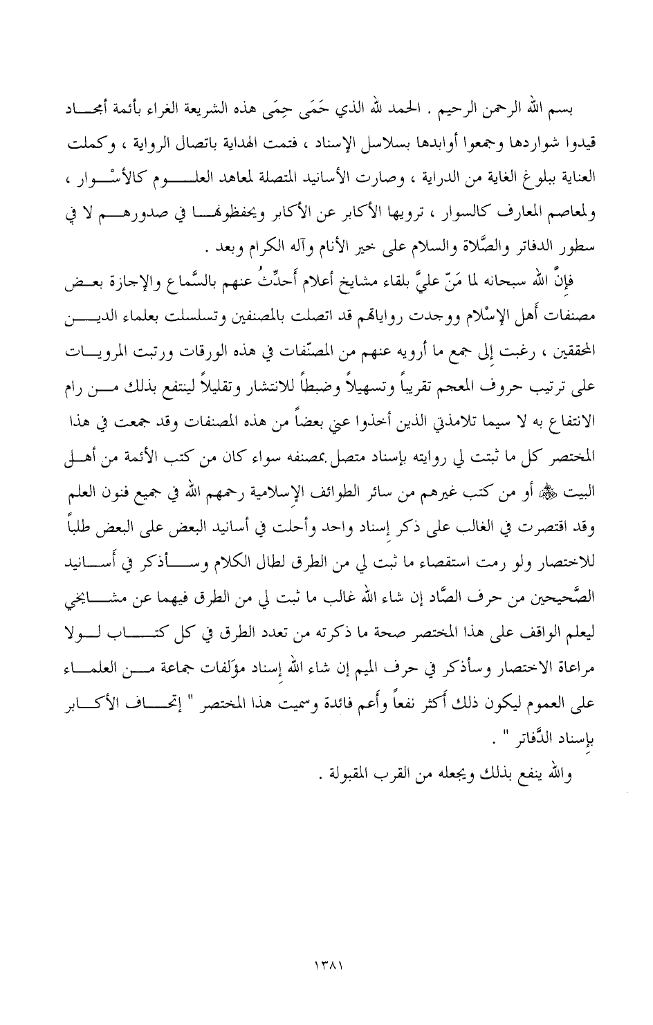بسم الله الرحمن الرحيم. الحمد لله الذي حمى حمى هذه الشريعة الغراء بأئمة أمجاد قيدوا شواردها وجمعوا أوابدها بسلاسل الإسناد، فتمت الهداية باتصال الرواية، وكملت العناية ببلوغ الغاية من الدراية، وصارت الأسانيد المتصلة لمعاهد العلوم كالأسوار، ولمعاصم المعارف كالسوار، ترويها الأكابر عن الأكابر ويحفظوها في صدورهم لا في سطور الدفاتر والصلاة والسلام على خير الأنام واله الكرام وبعد.