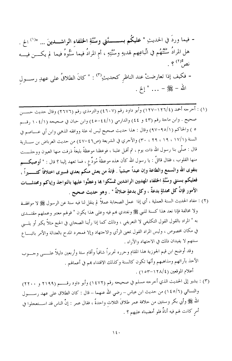 (¬1) أخرجه أحمد (4/ 126 - 127) وأبو داود رقم (4607) والترمذي رقم (2676) وقال حديث حسن صحيح. وابن ماجه رقم (43 و44) والدارمي (1/ 44 - 45) وابن حبان في صحيحه (1/ 104 رقم 5) والحاكم (1/ 95 - 97) وقال: هذا حديث صحيح ليس له علة ووافقه الذهبي وابن أبي عاصم في السنة (1/ 17، 19، 29، 30) والآجري في الشريعة (ص 46 - 47) من حديث العرباض بن سارية قال: صلى بنا رسول الله ذات يوم، ثم أقبل علينا، فوعظنا موعظة بليغة ذرفت منها العيون ووجلت منها القلوب، فقال قائل: يا رسول الله كأن هذه موعظة مودع، فما تعهد إلينا؟ قال: " أوصيكم بتقوى الله والسمع والطاعة وإن عبدا حبشيا. فإنه من يعش منكم بعدي فسيرى اختلافا كثيرا، فعليكم بسنتي وسنة الخلفاء المهديين الراشدين تمسكوا بها وعضوا عليها بالنواجذ وإياكم ومحدثات الأمور فإن كل محدثة بدعة، وكل بدعة ضلالة ". وهو حديث صحيح.