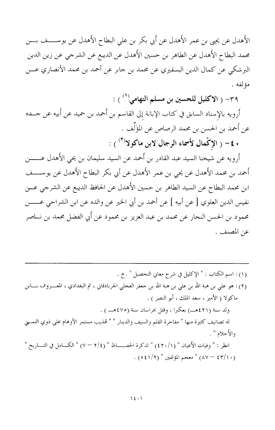 40 - (الإكمال لأسماء الرجال لابن ماكولا (¬2): أرويه عن شيخنا السيد عبد القادر بن أحمد عن السيد سليمان بن يحيى الأهدل عن أحمد بن محمد الأهدل عن ير بن عمر الأهدل عن أبي بكر البطاح الأهدل عن يوسف ابن محمد البطاح عن السيد الطاهر بن حسين الأهدل عن الحافظ الديبع عن الشرجي عن نفيس الدين العلوي أ عن أبيه أ عن أحمد بن أبي الخير عن والده عن ابن الشرجي عن محمود بن الحسن النجار عن محمد بن عبد العزيز بن محمود عن أبي الفضل محمد بن ناصر عن المصنف.