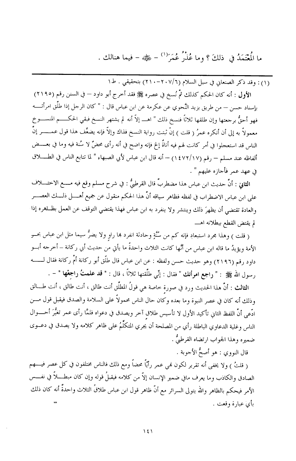 (قلت) وهذا مجرد استبعاد فإنه كم من سنة وحادثة انفرد بها راو ولا يضر سيما مثل ابن عباس بحر الأمة ويؤيد ما قاله ابن عباس من أنها كانت الثلاث واحدة ما يأتي من حديت أبي ركانة- أخرجه أبو داود رقم (2196) وهو حديث حسن ولفظه: عن ابن عباس قال طلَّق أبو ركانة أم ركانة فقال له رسول الله صَلَّى اللهُ عَلَيْهِ وَسَلَّمَ: " راجع امرأتك " فقال: إني طلقتها ثلاثا، قال: " قد علمت، راجعها "-.