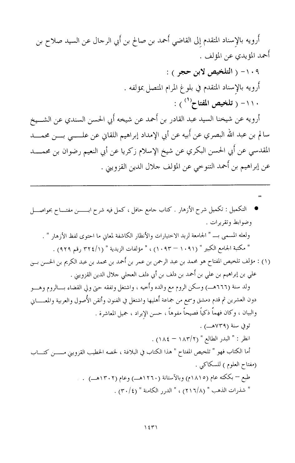 (تلخيص المفتاح (¬1) أرويه عن شيخنا السيد عبد القادر بن أحمد عن شيخه أبي الحسن السندي عن الشيخ سالم بن عبد الله البصري عن أبيه عن أبي الإمداد إبراهيم اللقاني عن علي بن محمد المقدسي عن أبي الحسن البكري عن شيخ الإسلام زكريا عن أبي النعيم رضوان بن محمد عن إبراهيم بن أحمد التنوخي عن المؤلف جلال الدين القزويني.
