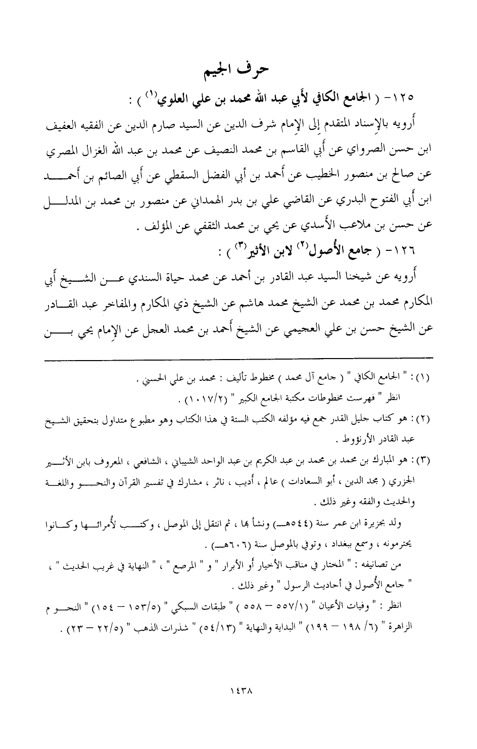 126 - (جامع الأصول (¬2) لابن الأثر) (¬3): أرويه عن شيخنا السيد عبد القادر بن أحمد عن محمد حياة السندي عن الشيخ أبي المكارم محمد بن محمد عن الشيخ محمد هاشم عن الشيخ ذي المكارم والمفاخر عبد القادر عن الشيخ حسن بن على العجيمي عن الشيخ أحمد بن محمد العجل عن الإمام يحيى بن
