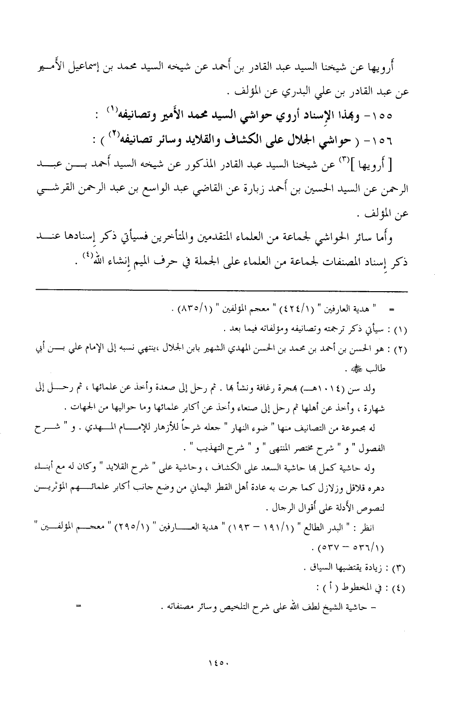 156 - (حواشي الجلال على الكشاف والقلايد وسائر تصانيفه (¬2): أرويها (¬3) عن شيخنا السيد عبد القادر المذكور عن شيخه السيد أحمد بن عبد الرحمن عن السيد الحسن بن أحمد زبارة عن القاضي عبد الواسع بن عبد الرحمن القرشي عن المؤلف.