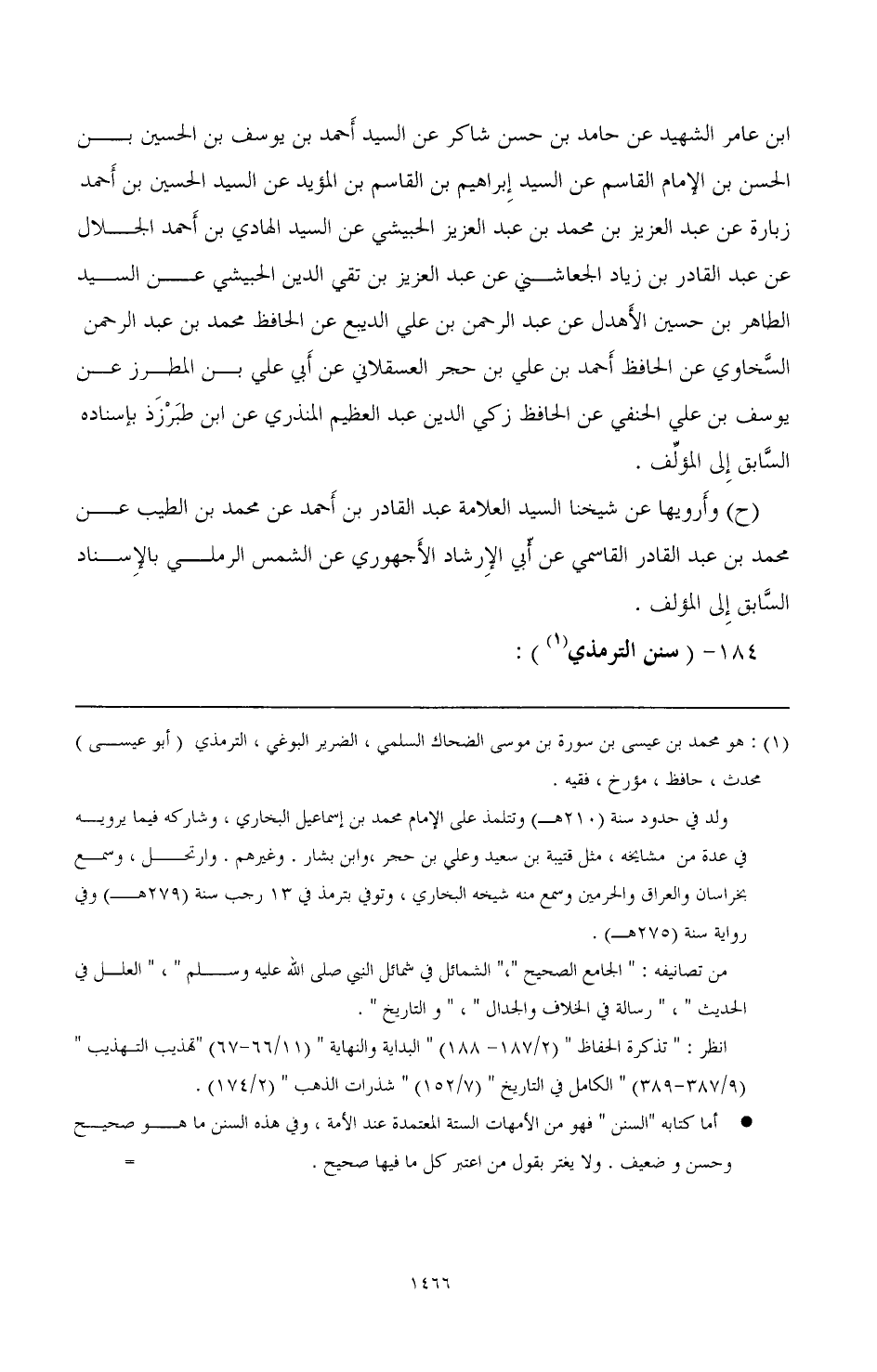 (ح) وأرويها عن شيخنا السيد العلامة عبد القاضي بن احمد عن محمد بن الطيب عن محمد بن عبد القادر القاسمي عن أبي الإرشاد الأجهوري عن الشمس الرملي بالإسناد السابق إلى المؤلف.
