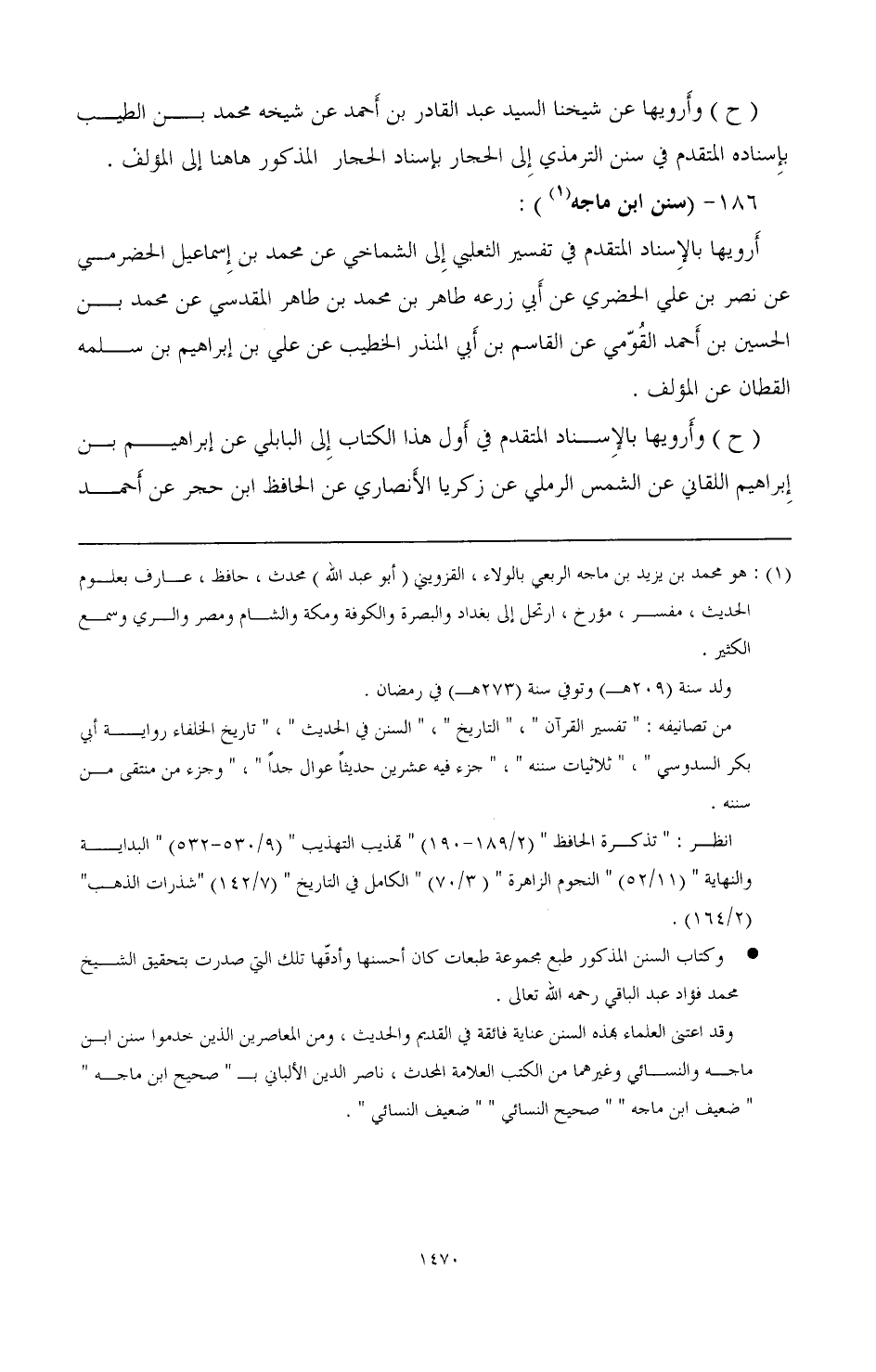 (¬1) هو محمد بن يزيد بن ماجه الربعي بالولاء، القزويى (أبو عبد الله) محدث، حافظ، عارف بعلوم الحديث، مفسر، مؤرخ، ارتحل إلى بغداد والبصرة والكوفة ومكة والشام ومصر والري وسمع الكثير.