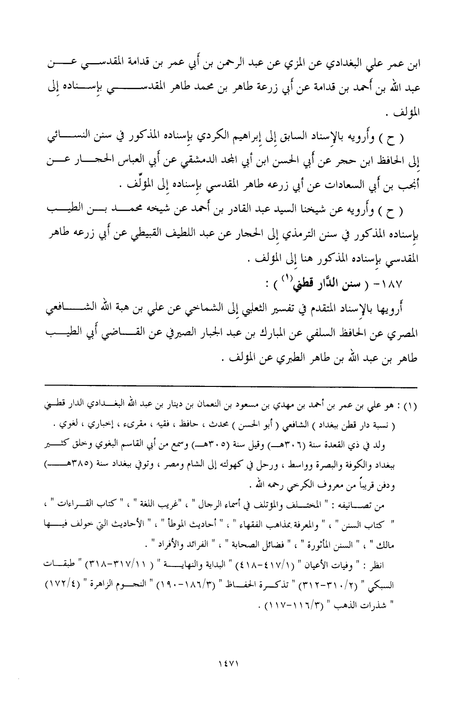 187 - (سنن الدار قطني) (¬1): أرويها بالإسناد المتقدم في تفسير الثعلبي إلى الشماخي عن علي بن هبة الله الشافعي المصري عن الحافظ السلفي عن المبارك بن عبد الجبار الصيرفي عن القاضي أبي الطيب طاهر بن عبد الله بن طاهر الطبري عن المؤلف.