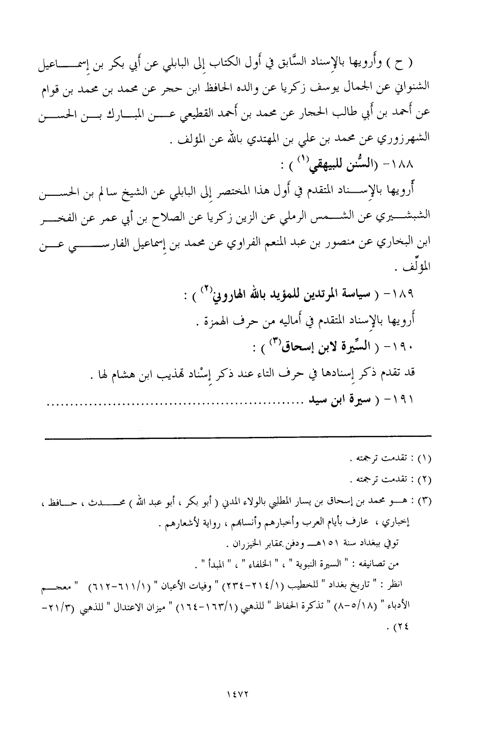 190 - (السيرة لابن إسحاق) (¬3): قد تقدم ذكر إسنادها في حرف التاء عند ذكر إسناد تهذيب ابن هشام لها.