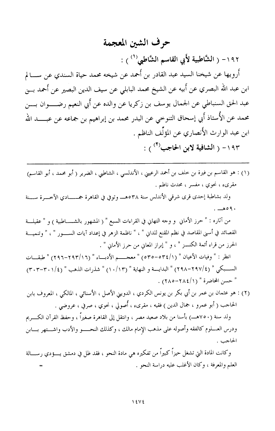 192 - (الشاطبية لأبي القاسم الشاطبي) (¬1): أرويها عن شيخنا السيد عبد القادر بن أحمد عن شيخه محمد حياة السندي عن سالم ابن عبد الله البصري عن أبيه عن الشيخ محمد البابلي عن سيف الدين البصير عن أحمد بق عبد الحق السنباطي عن الجمال يوسف بن زكريا عن والده عن أبي النعيم رضوان بن محمد عن الأستاذ أبي إسحاق التنوخي عن البدر محمد بن إبراهيم بن جماعه عن عبد الله ابن عبد الوارث الأنصاري عن المؤلف الناظم.