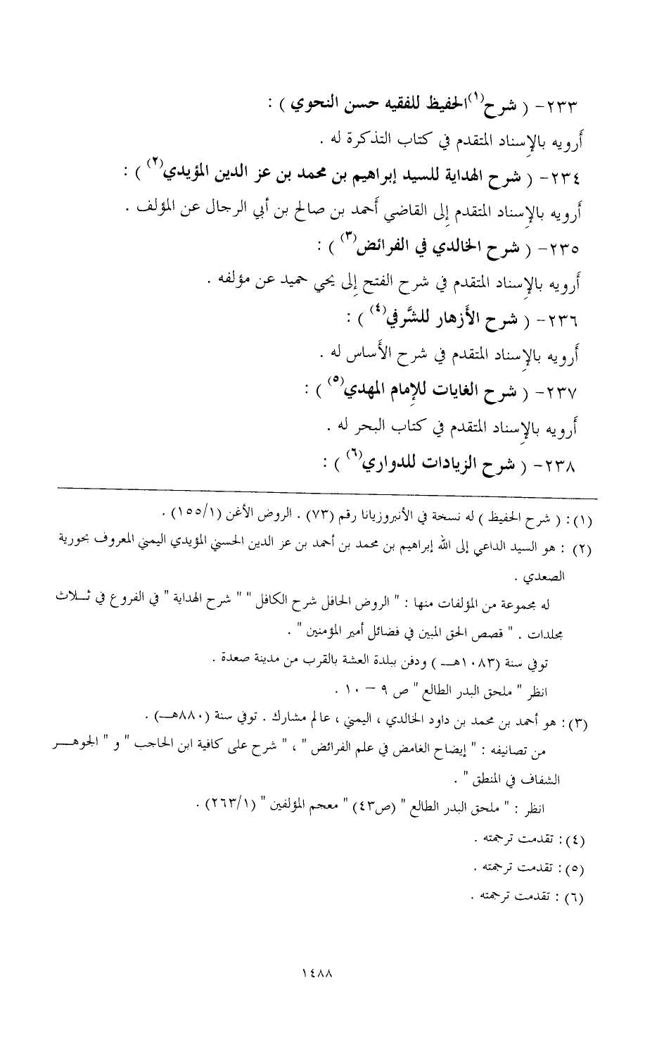 234 - (شرح الهداية للسيد إبراهيم بن محمد بن عز الدين المؤيدي (¬2): أرويه بالإسناد المتقدم إلى القاضي أحمد بن صاع بن أبي الرجال عن المؤلف. 235 - (شرح الخالدي في الفرائض) (¬3): أرويه بالإسناد المتقدم في شرح الفتح إلى ير حميد عن مؤلفه.