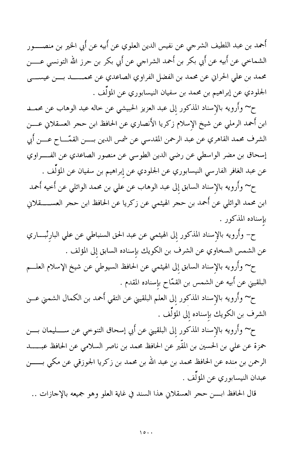 ح- وأرويه بالإسناد السابق إلى عبد الوهاب عن علي بن محمد الوائلي عن أخيه أحمد ابن محمد الوائلى عن أحمد بن حجر الهيثمي عن زكريا عن الحافظ ابن حجر العسقلاني بإسناده المذكور.