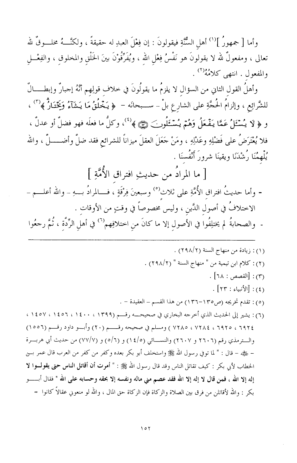 (¬6) يشير إلى الحديث الذي أخرجه البخاري في صحيحه رقم (1399، 1400، 1456، 1457، 6924، 6925، 7284، 7285) ومسلم في صحيحه رقم (0 2) وأبو داود رقم (1556) والترمذي رقم (2606 و2607) والنسائي (5/ 14) و (6/ 5) و (7/ 77) من حديث أبي هريرة -رضي الله عنه- قال: " لما توفي رسول الله صَلَّى اللهُ عَلَيْهِ وَسَلَّمَ واستخلف أبو بكر بعده وكفر من كفر من العرب قال عمر بن الخطاب لأبي بكر: كيف تقاتل الناس وقد قال رسول الله صَلَّى اللهُ عَلَيْهِ وَسَلَّمَ: " أمرت أن أقاتل الناس حتى يقولوا لا إله إلا الله، فمن قال لا إله إلا الله فقد عصم مني ماله ونفسه إلا بحقه وحسابه على الله " فقال أبو بكر: والله لأقاتلن من فرق بين الصلاة والزكاة فإن الزكاة حق المال، والله لو منعوني عقالا كانوا يؤدونه إلى رسول الله صَلَّى اللهُ عَلَيْهِ وَسَلَّمَ لقاتلتهم على منعه. فقال عمر بن الخطاب: فوالله ما هو إلا أن رأيت الله عز وجل قد شرح صدر أبى بكر للقتال فعرفت أنه الحق ".