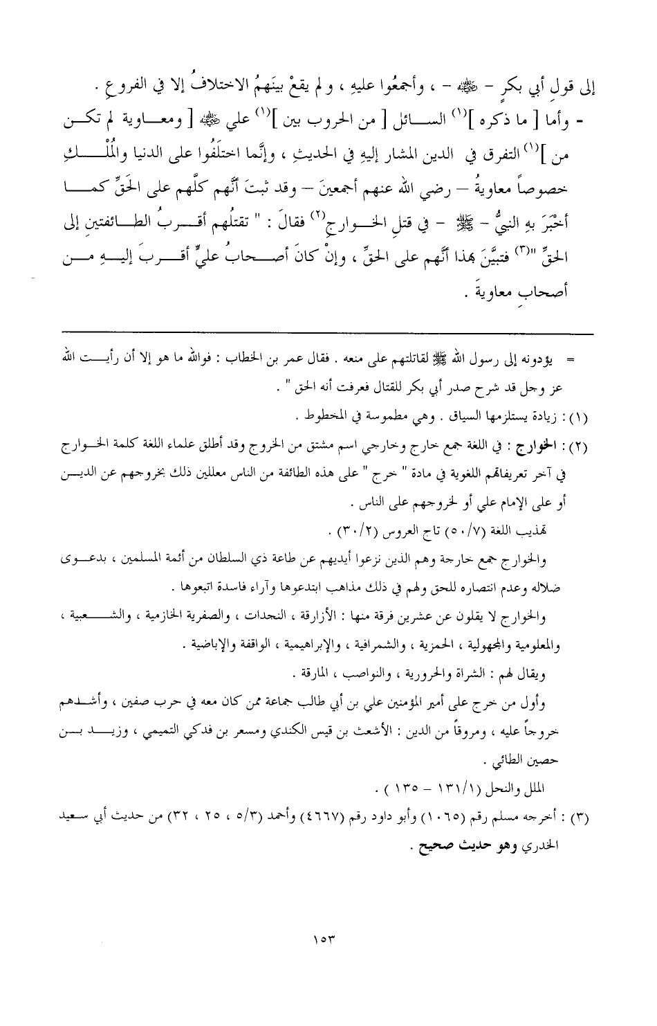 - وأما [ما ذكره] (¬1) السائل [من الحروب بين] (¬2) علي رضي الله عنه [ومعاوية لم تكن من] (¬3) التفرق في الدين المشار إليه في الحديث، وإنما اختلفوا على الدنيا والملك خصوصا معاوية- رضي الله عنهم أجمعين- وقد ثبت أنهم كلهم على الحق كما أخبر به النبي صَلَّى اللهُ عَلَيْهِ وَسَلَّمَ- في قتل الخوارج (¬4) فقال: " تقتلهم أقرب الطائفتين إلى الحق" (¬5) فتبين هذا أنهم على الحق، وإن كان أصحاب علي أقرب إليه من أصحاب معاوية.