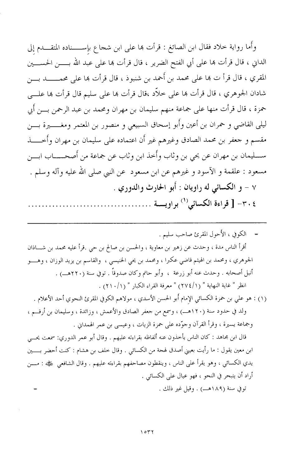(¬1) هو علي بن حمزة الكسائي الإمام أبو الحسن الأسدي، مولاهم الكوفي المقرئ النحوي أحد الأعلام. ولد في حدود سنة (120 هـ)، وعمن جعفر الصادق والأعمش، وزائدة، وسليمان بن أرقم، وجماعة يسيرة، وقرأ القرآن وجوده على حمزة الزيات، وعيسى بن عمر الهمداني.