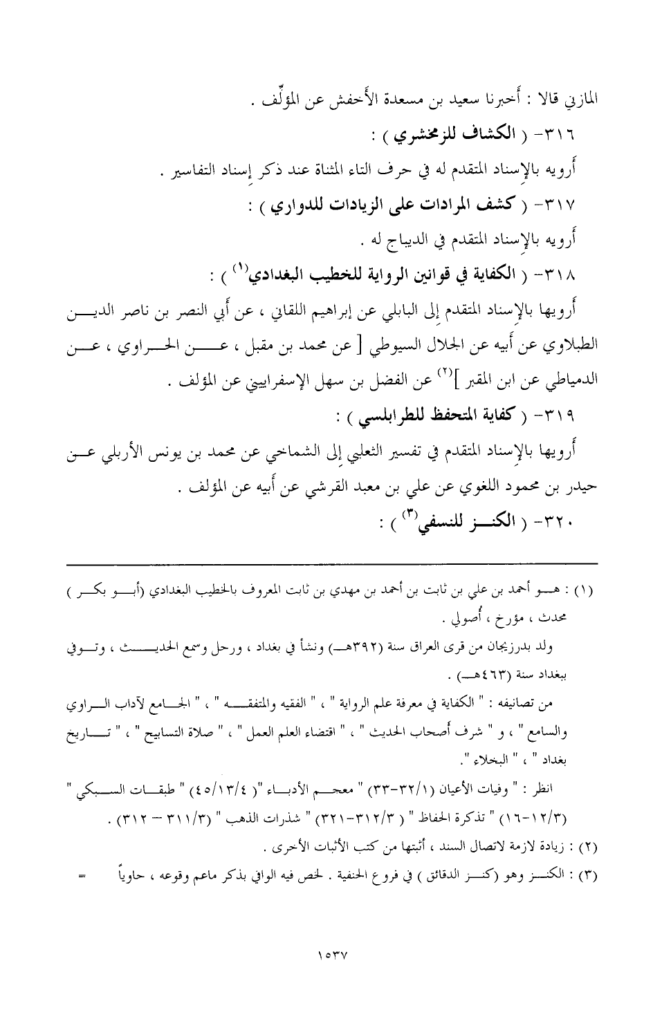 318 - (الكفاية في قوانين الرواية للخطيب البغدادي (¬1)): أرويها بالإسناد المتقدم إلى البابلي عن إبراهيم اللقاني، عن أبي النصر بن ناصر الدين الطبلاوي عن أبيه عن الجلال السيوطي [عن محمد بن مقبل، عن الحراوي، عن الدمياطي عن ابن المقبر] (¬2) عن الفضل بن سهل الإسفراييني عن المؤلف.