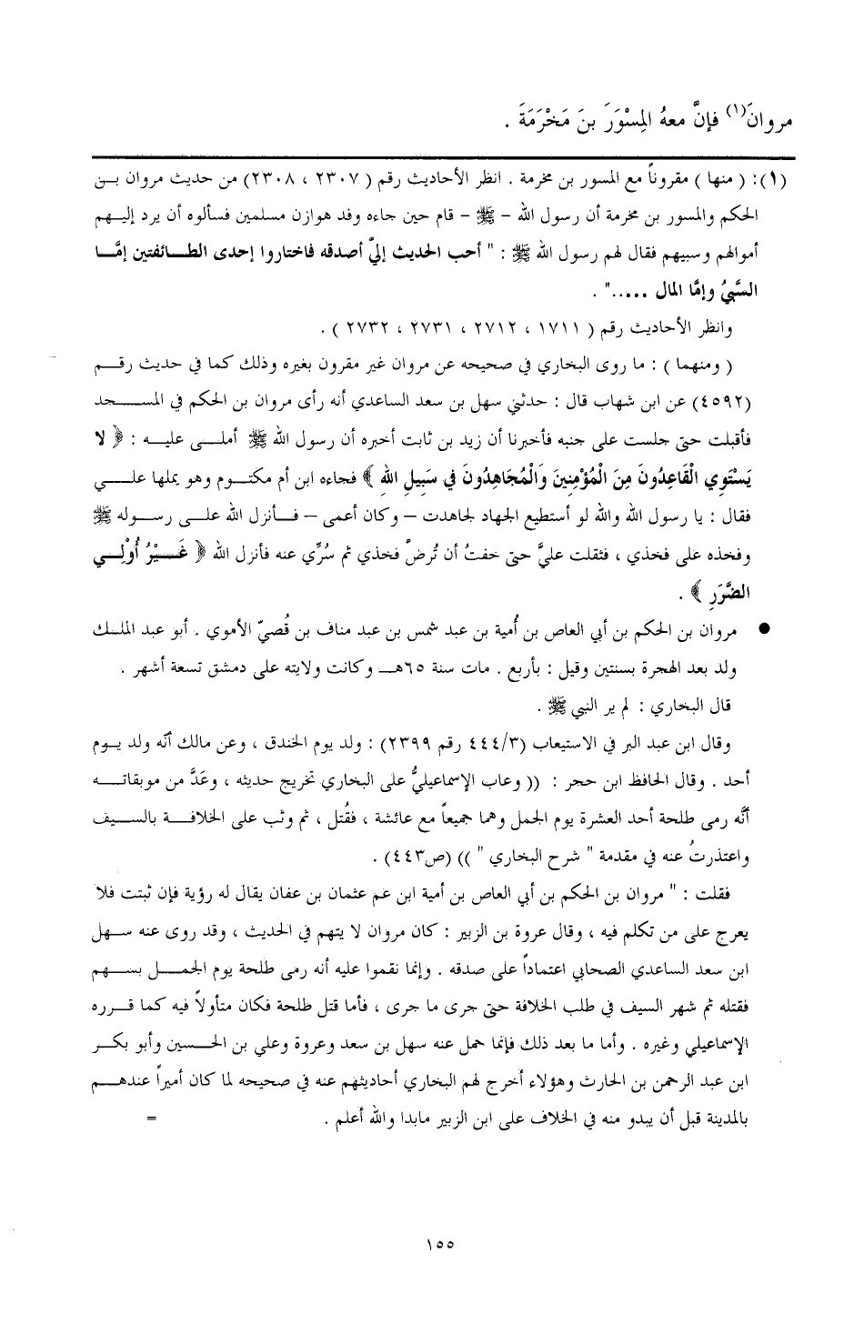 (¬1) (منها) مقرونا مع المسور بن مخرمة. انظر الأحاديث رقم (2307، 2308) من حديث مروان بين الحكم والمسور بن مخرمة أن رسول الله -صَلَّى اللهُ عَلَيْهِ وَسَلَّمَ- قام حين جاءه وفد هوازن مسلمين فسألوه أن يرد إليهم أموالهم وسبيهم فقال لهم رسول الله صَلَّى اللهُ عَلَيْهِ وَسَلَّمَ: " أحب الحديث إلي أصدقه فاختاروا إحدى الطائفتين إما السبي وإما المال ..... ".