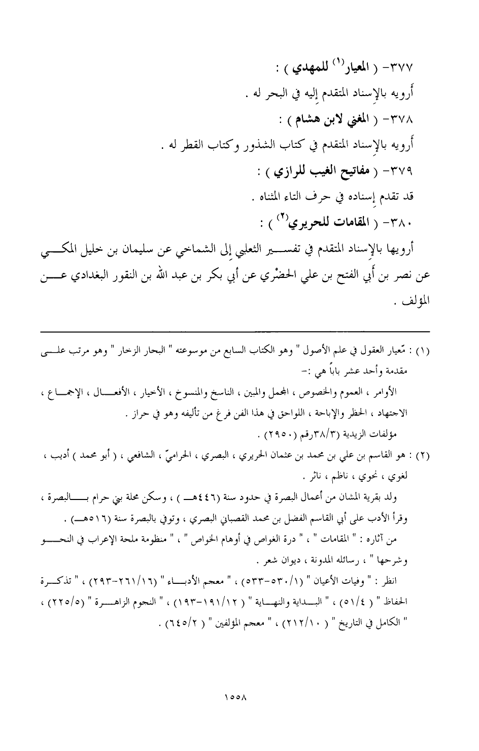 380 - (المقامات للحريري (¬2)): أرويها بالإسناد المتقدم في تفسير الثعلبي إلى الشماخي عن سليمان بن خليل المكي عن نصر بن أبي الفتح بن على الحضري عن أبي بكر بن عبد الله بن النقور البغدادي عن المؤلف.