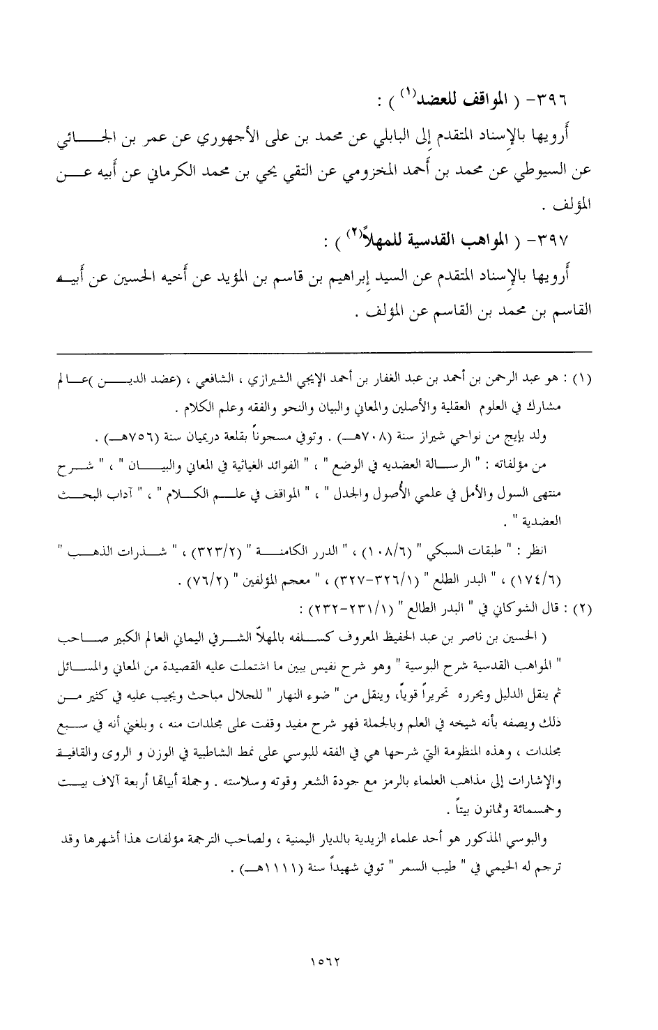 396 - (المواقف للعضد (¬1)): أرويها بالإسناد المتقدم إلى البابلي عن محمد بن على الأجهوري عن عمر بن الجائي عن السيوطي عن محمد بن أحمد المخزومي عن التقى يحي بن محمد الكرماني عن أبيه عن المؤلف.