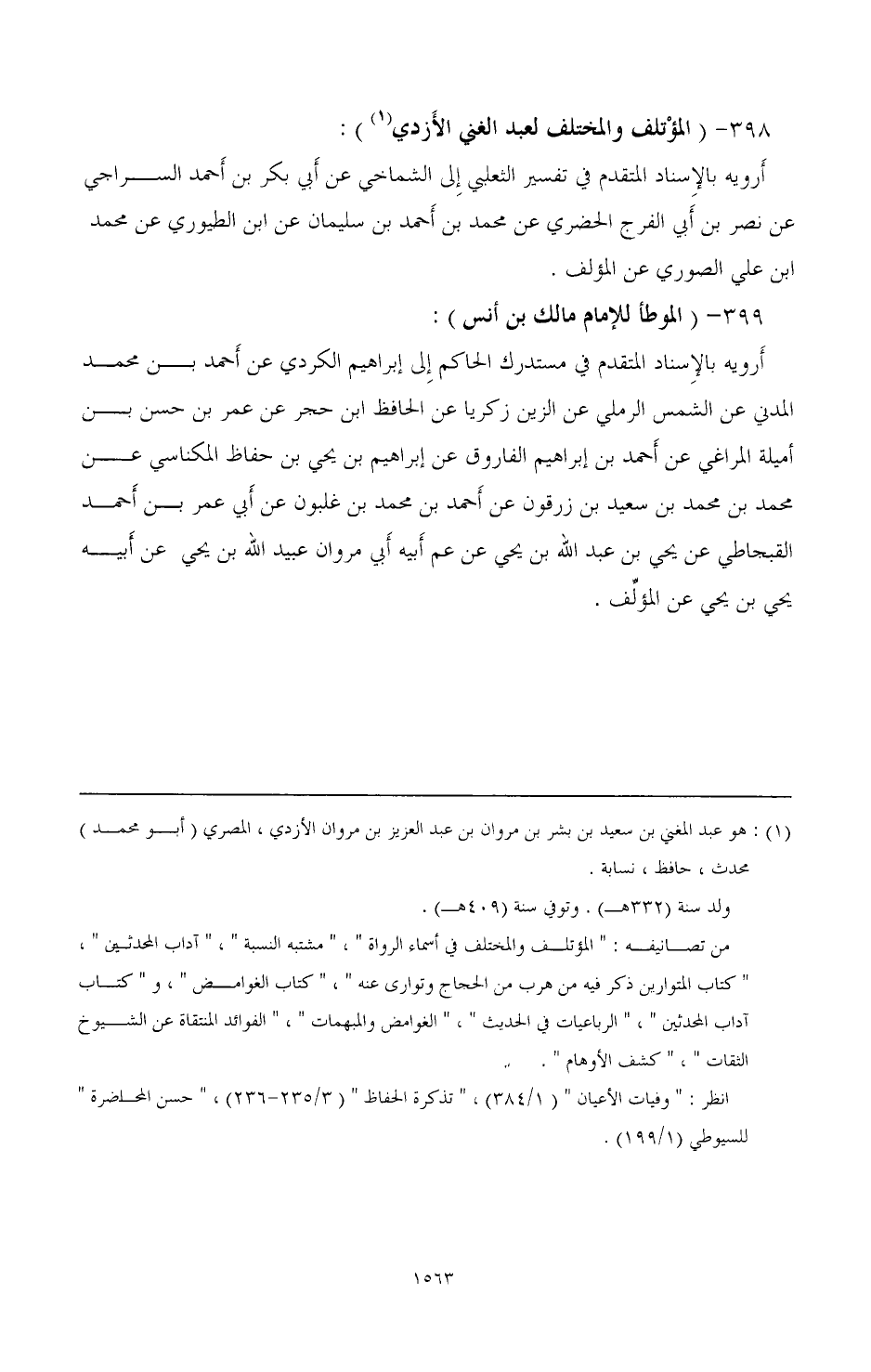 398 - (المؤتلف والمختلف لعبد الغني الأزدي (¬1)): أرويه بالإسناد المتقدم في تفسير الثعلبي إلى الشماخي عن أبي بكر بن أحمد السراجي عن نصر بن أبي الفرج الحضري عن محمد بن أحمد بن سليمان عن ابن الطيوري عن محمد ابن علي الصوري عن المؤلف.