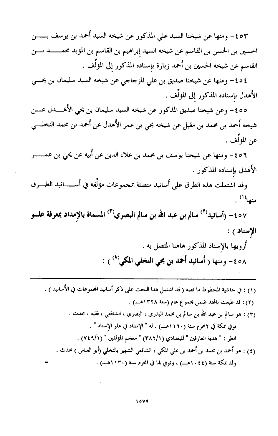 455 - وعن شيخنا صديق المذكور عن شيخه السيد سليمان بن يحي الأهدل عن شيخه أحمد بن محمد بن مقبل عن شيخه يحي بن عمر الأهدل عن أحمد بن محمد النخلي عن المؤلف.