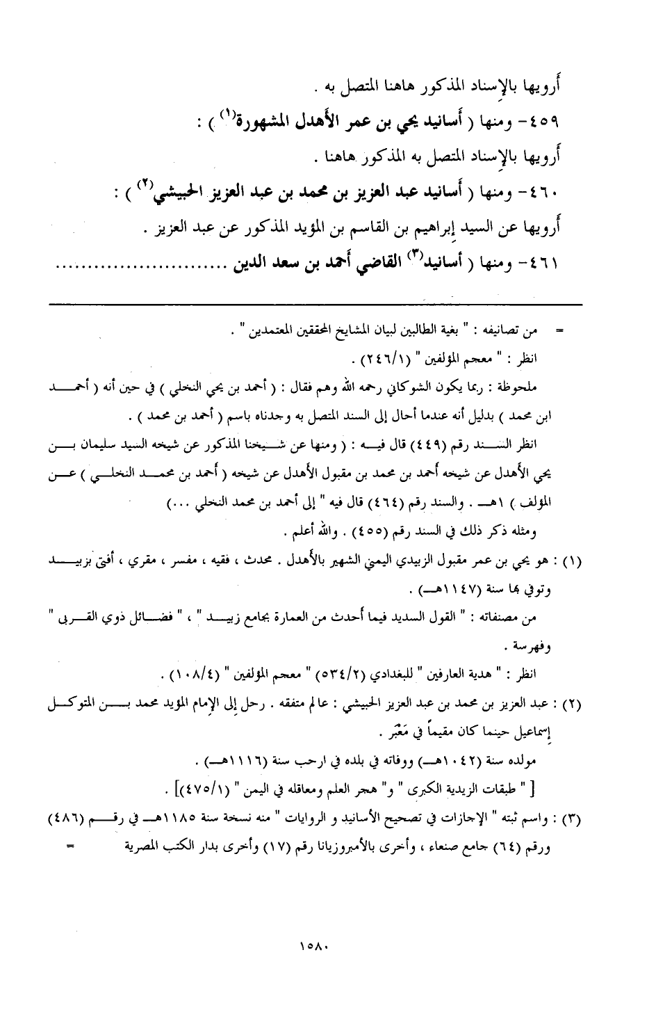 460 - ومنها (أسانيد عبد العزيز بن محمد بن عبد العزيز الحبيشي (¬2)): أرويها عن السيد إبراهيم بن القاسم بن المؤيد المذكور عن عبد العزيز.