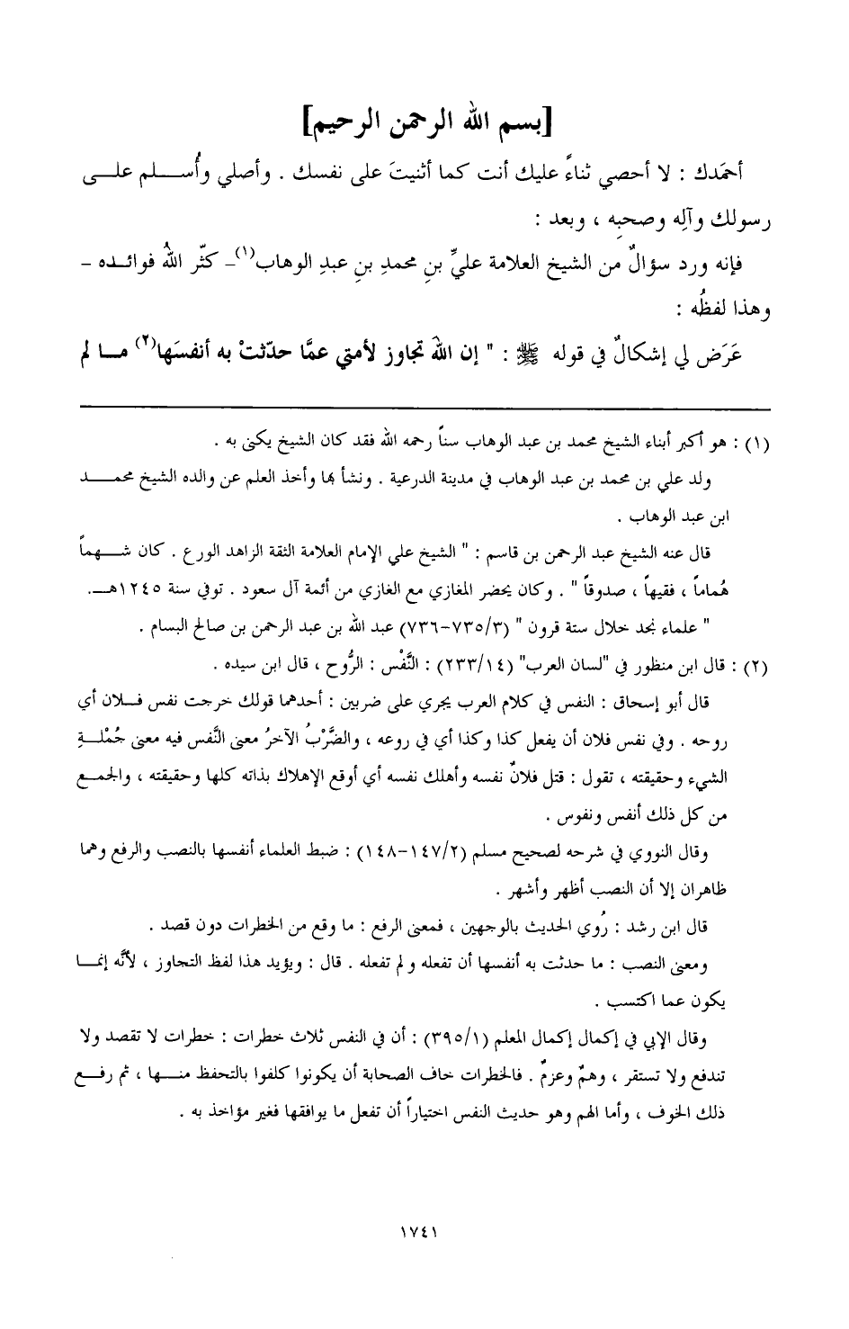 تتكلم أو تعمل به" (¬1): ما هو هذا المغفور؟ هل هو شيء يستقر في القلب (¬2)، ويريده الإنسان أم هو خاطر يمر على القلب لا يستقر (¬3)، ولا يريده الإنسان؟ فإن كان الأول: فكيف من نوى الردة مثلًا -والعياذ بالله- ولم يرتكب موجبها من قول أو فعل؟ وكذلك من عزم على فعل ذنب من الذنوب في حينه أم معلقًا على وصول شيء ونحو ذلك؟ وكذلك من دخل في عبادة من صلاة أو صيام أو طهارة (¬4) ثم نوى إبطالها والخروج منها من غير فعل يوجب البطلان؟